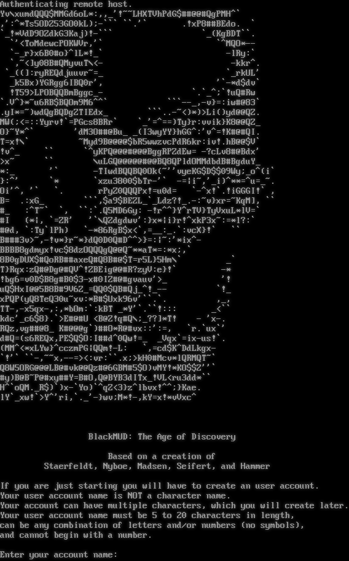 Authenticating remote host. Yv\\xumdQQQ$MMGd6oL\*:,,_'!~~LHXTVhPdG$##@@#QgPMH^\` ,':^\*Ts5ODZ53GO0kL);-\`\`\` \`\`.'\` .!xP8##BEdo. \` \`_!\*VdD9OZdkG3Kaj)!-\`\`\` \`_(KgBDT\`\`. \`'<ToMdewcPOKWVr,'\` \`^MQO\*-- \`-_r}x6B0#o}^lL\*!_\` -lRy:\` \`,~<]y08B#QMyvuT\\<- -kkr^. \`_((]:ryREQdjuuvr~=_ \`_rkUL' _k5Bx)YGRgg6IBQ0r', '\`-\*d$dv\` !T59>LPOBQQBmBggc_- \`.\`_^;\`!uQ#Rw \`.V^}\*~u6RB$BQOm9M6^^\` \`\`\`--_,-v}=:iw#@83\` .yI\*=~)wdQgBQDgZTIEdx_ \`\`\`.​.-~<)\*)>Li()yd@@QZ. MW(;<=::Yyrv!\`=PGcs8BRr\` \`_'=​^==)Ty}r:vvik}K8@@QZ_ O}~Y\*^\` 'dM3O##@Bu_ _(I3wyYY}hGG^:'v^=!K#@#QI. T=x!\\\` ~Myd9B@@@@$bR5wwzvcPdR6kr:iv!.hB@@$V\` !v^_ \`\` \`^yKPQ@@@#@@@BggRPZdEw= -?cLv8#@Bdx' >x~ \`\` \\uLGQ@@@@@#@@BQ8QPldOMMdbdB#BgduY_ \*:_ '\` -TIwdBQQBQ0Ok(~''vyeKG$D$$09Wy;_o^(i\` }:^' \`\* \`xzu3800$bTr-'\` -=\|i~,'_i)^\*\*=^u=​_~. Oi'^, '\` \`. rPyZ0QQQPx!=u0d= \`-^x!\`.!iGGGI!\` , B= .:xG_ \`\`\`,$a9$BEZL_\`_Ldz?!_.-:~v}xr=~KqM], \`\` #_ :^T~\` \`, \`\`:\`.Q5MD6Gy: -!r^^}Y^rTV}TyVxuL\*lV=\` #I (\*\|, \`=ZR' '\`\\QZdgdwv':}x\*\|i}r!^xkP3x~:=\*l?:\` #@d, \`:Ty\`lPh) \`-\*86RgB$x<\`,=__:_.\`:vcX}!\` \`\` B###3v>~,-!v\*}r~\*}dQ0D0Q#D^^>}=:\|~:'\*ix^- BBBB8gdmyx!vc$8dzOQQQgQ@@Q~\*\*aT\*=:\*x;,\` 8B0gDUX$#QoRB##axeQ#Q8B#@$T=r5L}5Hm\\\` _\` T}Rqx:zQ#@Dg@#QV^!ZBEig@@#R?zyV:e}!\` -\* !bg6=v0D$B8g#B0$3-x#0IZ#@#gvauv'>_ '! uQ$HxI@@5B8B#9V6Z_=QQ0$QB#Qj_^!_-- \`!_ xPQP(yQ8TeQ30u~xv:\*B#$Uxk96v'\`\`.\`. ,_, TT-,-x5qx-,:,\*bOm:\`:kBT _\*Y'\`.\`\`!::: _<\`\` kdc'_c6$8}.\`>E#@#U <B@Z!q#Q\\;_??]\*T! - 'x-. RQz,vg##@8_ K#@@@g\`)##O\*R@#vx::':=, \`r.\`ux\`' d#Q=(s6REQx,PE$Q$O:I##d^0Qw!=_ _Vqx\`=ix-us!\`. (MM^<\*xLYw}^cczmPG\|QQm!-L: \`,=cd$K^DdLkgx- \`!'\` \`\`-,~~x,--=><:vr:\`\`.x;>kH0#Mcv\*lQRMQT~\` Q8W5ORG@@@LB@#vk@@Qz#@6GBM#5$O)vMY!\*KO$$Z''\` #y)B@B~P@#xy##Y=B#O,Q@BYB3dITx_!VL<ru3dd\*\`\` H^\`oQM._R$)\`)x-\`Yo)\`^qZ<3}z^lbvx!^^;}Kae. lY\`_xw!\`>Y^'ri,\`._'-}wv;M\*!-,kY=x!\*vVxc^ BlackMUD: The Age of Discovery Based on a creation of Staerfeldt, Nyboe, Madsen, Seifert, and Hammer If you are just starting you will have to create an user account. Your user account name is NOT a character name. Your account can have multiple characters, which you will create later. Your user account name must be 5 to 20 characters in length, can be any combination of letters and/or numbers (no symbols), and cannot begin with a number. Enter your account name: