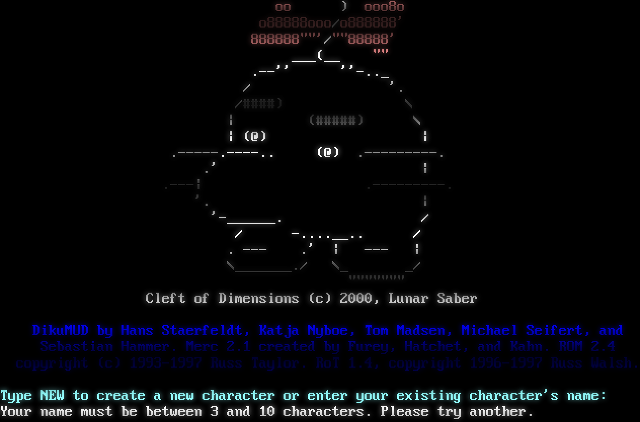 oo ) ooo8o o88888ooo/o888888' 888888""'/""88888' ___(__ "" .--'' ''-​.._ / '. /#​###) \\ \| (#​####) \\ \| (@) \| .​-----.----.. (@) .​---------. .' \| .​---\| .​---------. '. \| '-​______. / / -​....__.. / . --- .' \| --- \| \\_​______./ \\_ _/ "​"""""" Cleft of Dimensions (c) 2000, Lunar Saber DikuMUD by Hans Staerfeldt, Katja Nyboe, Tom Madsen, Michael Seifert, and Sebastian Hammer. Merc 2.1 created by Furey, Hatchet, and Kahn. ROM 2.4 copyright (c) 1993-1997 Russ Taylor. RoT 1.4, copyright 1996-1997 Russ Walsh. Type NEW to create a new character or enter your existing character's name: Your name must be between 3 and 10 characters. Please try another.