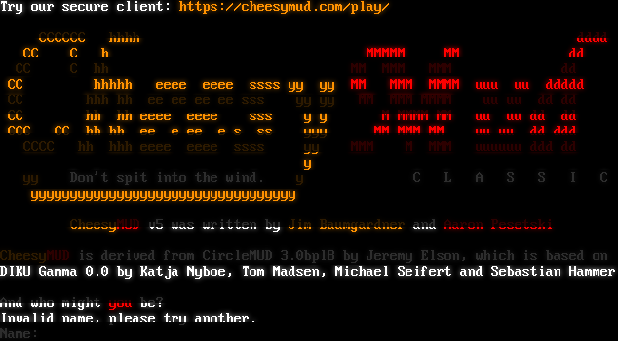 This connection is not secure! Try our secure client: https://cheesymud.com/play/ CCCCCC hhhh dddd CC C h MMMMM MM dd CC C hh MM MMM MMM dd CC hhhhh eeee eeee ssss yy yy MM MMM MMMM uuu uu ddddd CC hhh hh ee ee ee ee sss yy yy MM MMM MMMM uu uu dd dd CC hh hh eeee eeee sss y y M MMMM MM uu uu dd dd CCC CC hh hh ee e ee e s ss yyy MM MMM MM uu uu dd ddd CCCC hh hhh eeee eeee ssss yy MMM M MMM uuuuuu ddd dd y yy Don't spit into the wind. y C L A S S I C yyyyyyyyyyyyyyyyyyyyyyyyyyyyyyyyyy CheesyMUD v5 was written by Jim Baumgardner and Aaron Pesetski CheesyMUD is derived from CircleMUD 3.0bpl8 by Jeremy Elson, which is based on DIKU Gamma 0.0 by Katja Nyboe, Tom Madsen, Michael Seifert and Sebastian Hammer And who might you be? Invalid name, please try another. Name: