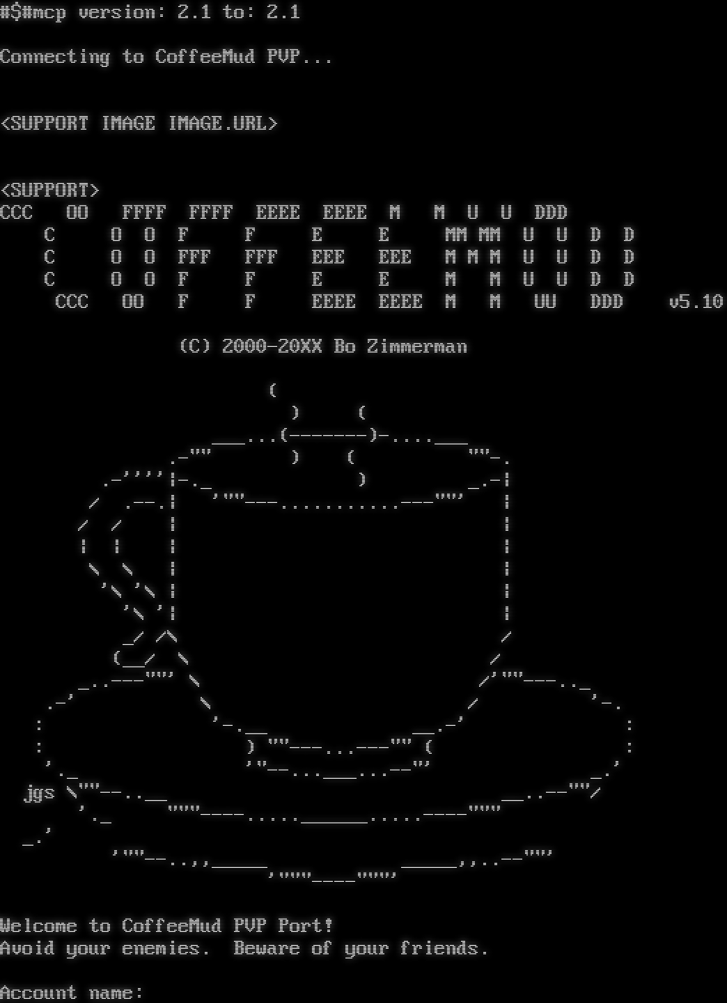 #$#mcp version: 2.1 to: 2.1 Connecting to CoffeeMud PVP... <SUPPORT IMAGE IMAGE.URL> <SUPPORT> CCC OO FFFF FFFF EEEE EEEE M M U U DDD C O O F F E E MM MM U U D D C O O FFF FFF EEE EEE M M M U U D D C O O F F E E M M U U D D CCC OO F F EEEE EEEE M M UU DDD v5.10 (C) 2000-20XX Bo Zimmerman ( ) ( _​__...(-​------)-​....___ .-&quot;&quot; ) ( &quot;&quot;-. .-''''\|-._ ) _.-\| / .​--.\| '&quot;&quot;-​--...........---&quot;&quot;' \| / / \| \| \| \| \| \| \\ \\ \| \| '\\ '\\ \| \| '\\ '\| \| _/ /\\ / (__/ \\ / _​..---&quot;&quot;' \\ /'&quot;&quot;-​--.._ .-' \\ / '-. : '-​.__ _​_.-' : : ) &quot;&quot;-​--...---&quot;&quot; ( : '._ '&quot;-​-...___...--&quot;' _.' jgs \\&quot;&quot;-​-..__ _​_..--&quot;&quot;/ '._ &quot;&quot;&quot;-​---.....______.....----&quot;&quot;&quot; _.' '&quot;&quot;-​-..,,_​____ _​____,,.​.--&quot;&quot;' '&quot;&quot;&quot;-​---&quot;&quot;&quot;' Welcome to CoffeeMud PVP Port! Avoid your enemies. Beware of your friends. Account name: