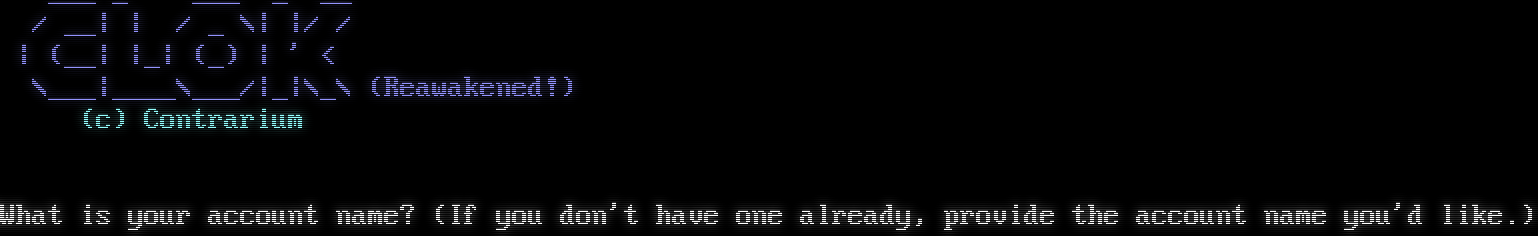 ___ _ ___ _ __ / __\| \| / _ \\\| \|/ / \| (__\| \|_\| (_) \| ' < \\___\|_​___\\___/\|_\|\\_\\ (Reawakened!) (c) Contrarium What is your account name? (If you don't have one already, provide the account name you'd like.)