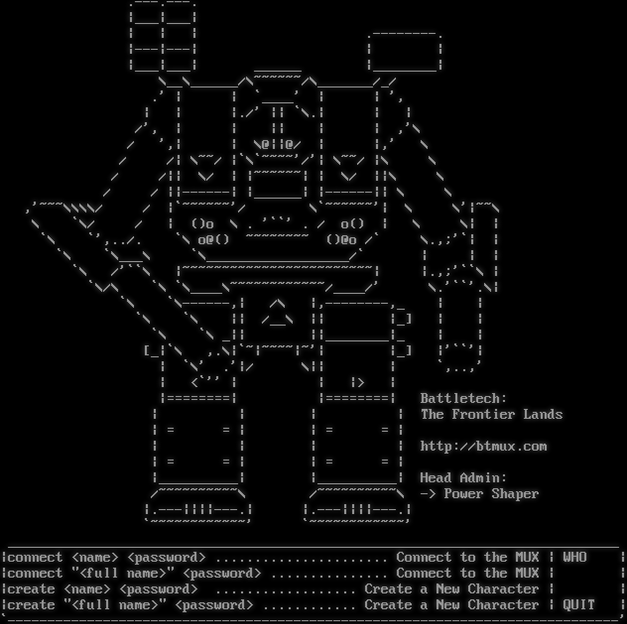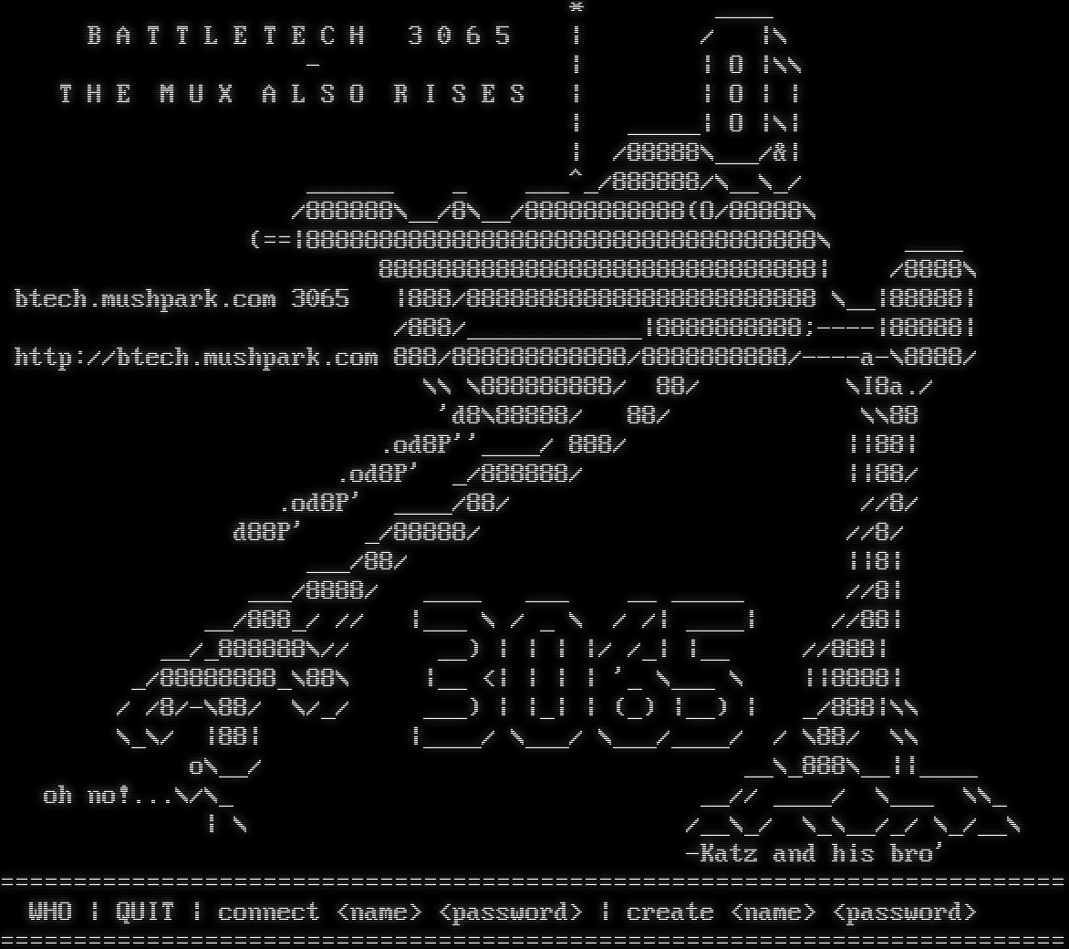 \* _​___ B A T T L E T E C H 3 0 6 5 \| / \|\\ - \| \| O \|\\\\ T H E M U X A L S O R I S E S \| \| O \| \| \| _​____\| O \|\\\| \| /88888\\___/&\| _​_____ _ _​__^_/888888/\\__\\_/ /888888\\__/8\\__/88888888888(O/88888\\ (==\|88888888888888888888888888888888888\\ _​___ 888888888888888888888888888888\| /8888\\ btech.mushpark.com 3065 \|888/888888888888888888888888 \\__\|88888\| /888/_​___________\|8888888888;-​---\|88888\| http://btech.mushpark.com 888/888888888888/8888888888/-​---a-\\8888/ \\\\ \\888888888/ 88/ \\I8a./ 'd8\\88888/ 88/ \\\\88 .od8P''_​___/ 888/ \|\|88\| .od8P' _/888888/ \|\|88/ .od8P' _​___/88/ //8/ d88P' _/88888/ //8/ ___/88/ \|\|8\| ___/8888/ _​___ ___ __ _​____ //8\| __/888_/ // \|___ \\ / _ \\ / /\| _​___\| //88\| __/_888888\\// __) \| \| \| \|/ /_\| \|__ //888\| _/88888888_\\88\\ \|__ <\| \| \| \| '_ \\___ \\ \|\|8888\| / /8/-\\88/ \\/_/ ___) \| \|_\| \| (_) \|__) \| _/888\|\\\\ \\_\\/ \|88\| \|_​___/ \\___/ \\___/_​___/ / \\88/ \\\\ o\\__/ __\\_888\\__\|\|_​___ oh no!...\\/\\_ __// _​___/ \\___ \\\\_ \| \\ /__\\_/ \\_\\__/_/ \\_/__\\ -Katz and his bro' =​======================================================================== WHO \| QUIT \| connect <name> <password> \| create <name> <password> =​========================================================================
