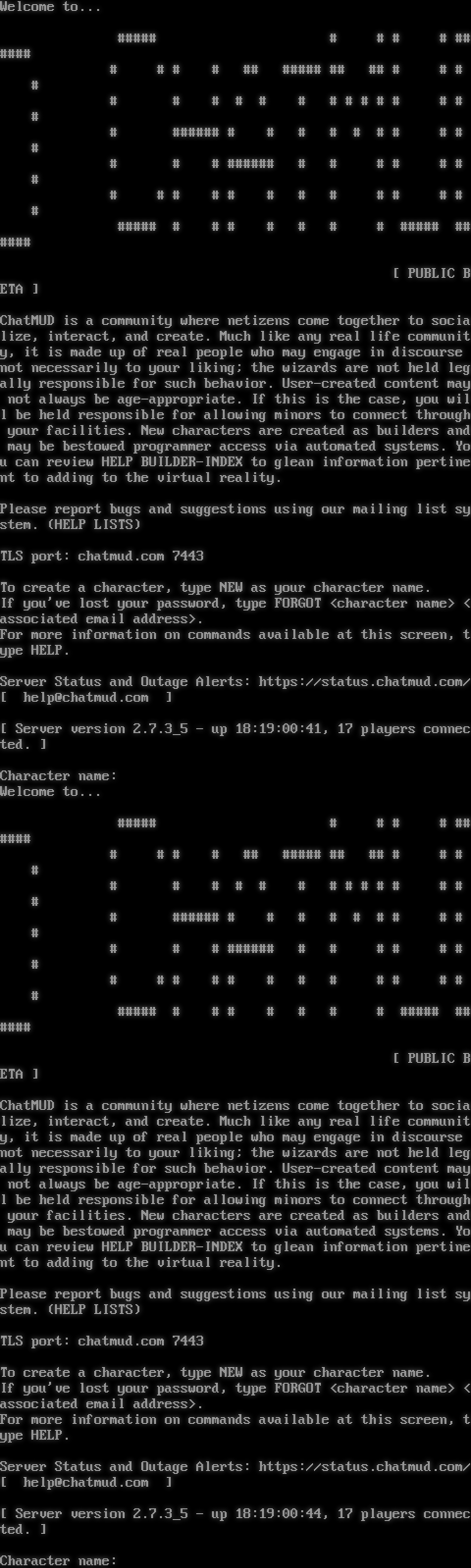 Welcome to... #​#### # # # # #​##### # # # # ## #​#### ## ## # # # # # # # # # # # # # # # # # # # #​##### # # # # # # # # # # # # # #​##### # # # # # # # # # # # # # # # # # # # # #​#### # # # # # # # #​#### #​##### [ PUBLIC BETA ] ChatMUD is a community where netizens come together to socialize, interact, and create. Much like any real life community, it is made up of real people who may engage in discourse not necessarily to your liking; the wizards are not held legally responsible for such behavior. User-created content may not always be age-appropriate. If this is the case, you will be held responsible for allowing minors to connect through your facilities. New characters are created as builders and may be bestowed programmer access via automated systems. You can review HELP BUILDER-INDEX to glean information pertinent to adding to the virtual reality. Please report bugs and suggestions using our mailing list system. (HELP LISTS) TLS port: chatmud.com 7443 To create a character, type NEW as your character name. If you've lost your password, type FORGOT <character name> <associated email address>. For more information on commands available at this screen, type HELP. Server Status and Outage Alerts: https://status.chatmud.com/ [ help@chatmud.com ] [ Server version 2.7.3_5 - up 18:19:00:41, 17 players connected. ] Character name: Welcome to... #​#### # # # # #​##### # # # # ## #​#### ## ## # # # # # # # # # # # # # # # # # # # #​##### # # # # # # # # # # # # # #​##### # # # # # # # # # # # # # # # # # # # # #​#### # # # # # # # #​#### #​##### [ PUBLIC BETA ] ChatMUD is a community where netizens come together to socialize, interact, and create. Much like any real life community, it is made up of real people who may engage in discourse not necessarily to your liking; the wizards are not held legally responsible for such behavior. User-created content may not always be age-appropriate. If this is the case, you will be held responsible for allowing minors to connect through your facilities. New characters are created as builders and may be bestowed programmer access via automated systems. You can review HELP BUILDER-INDEX to glean information pertinent to adding to the virtual reality. Please report bugs and suggestions using our mailing list system. (HELP LISTS) TLS port: chatmud.com 7443 To create a character, type NEW as your character name. If you've lost your password, type FORGOT <character name> <associated email address>. For more information on commands available at this screen, type HELP. Server Status and Outage Alerts: https://status.chatmud.com/ [ help@chatmud.com ] [ Server version 2.7.3_5 - up 18:19:00:44, 17 players connected. ] Character name: