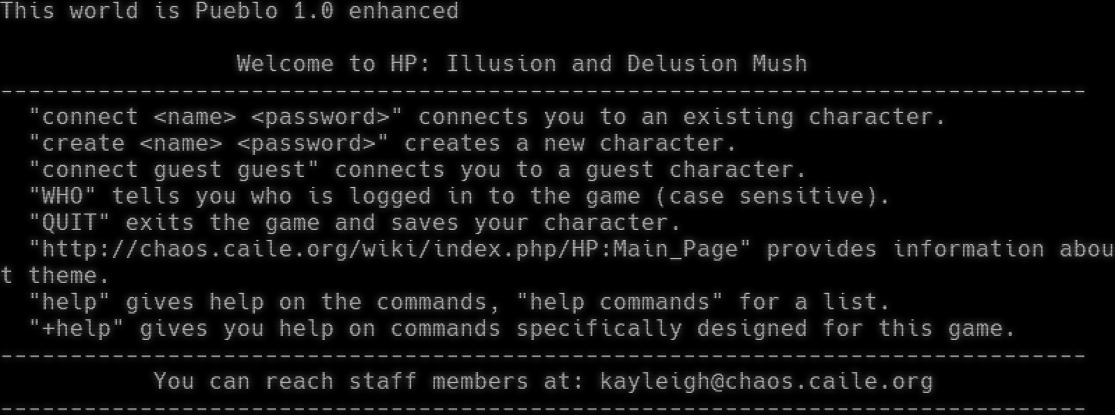 This world is Pueblo 1.0 enhanced Welcome to HP: Illusion and Delusion Mush -​----------------------------------------------------------------------------- "connect <name> <password>" connects you to an existing character. "create <name> <password>" creates a new character. "connect guest guest" connects you to a guest character. "WHO" tells you who is logged in to the game (case sensitive). "QUIT" exits the game and saves your character. "http://chaos.caile.org/wiki/index.php/HP:Main_Page" provides information about theme. "help" gives help on the commands, "help commands" for a list. "+help" gives you help on commands specifically designed for this game. -​----------------------------------------------------------------------------- You can reach staff members at: kayleigh@chaos.caile.org -​-----------------------------------------------------------------------------