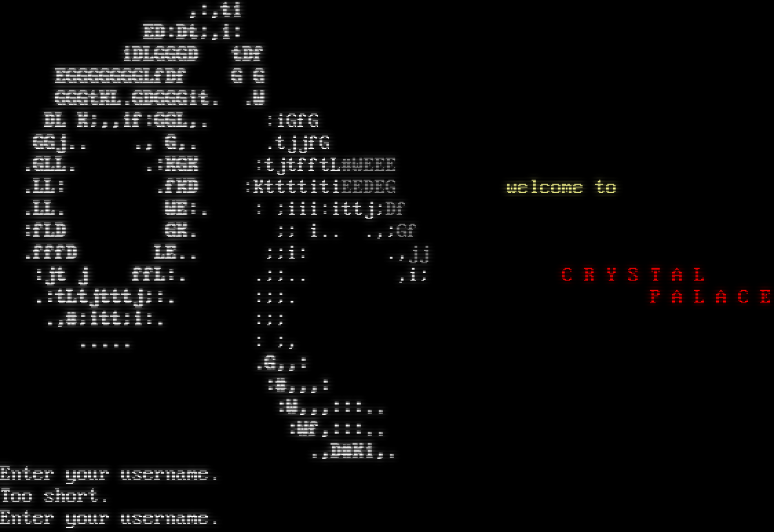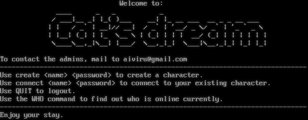 Welcome to: _​___ _ _ _ / ___\|__ _\| \|_( )___ __\| \|_ __ ___ __ _ _ __ ___ \| \| / _\` \| __\|// __\| / _\` \| '__/ _ \\/ _\` \| '_ \` _ \\ \| \|__\| (_\| \| \|_ \\__ \\ \| (_\| \| \| \| __/ (_\| \| \| \| \| \| \| \\_​___\\__,_\|\\__\| \|___/ \\__,_\|_\| \\___\|\\__,_\|_\| \|_\| \|_\| To contact the admins, mail to aiviru@gmail.com -​---------------------------------------------------------------------------- Use create <name> <password> to create a character. Use connect <name> <password> to connect to your existing character. Use QUIT to logout. Use the WHO command to find out who is online currently. -​---------------------------------------------------------------------------- Enjoy your stay.