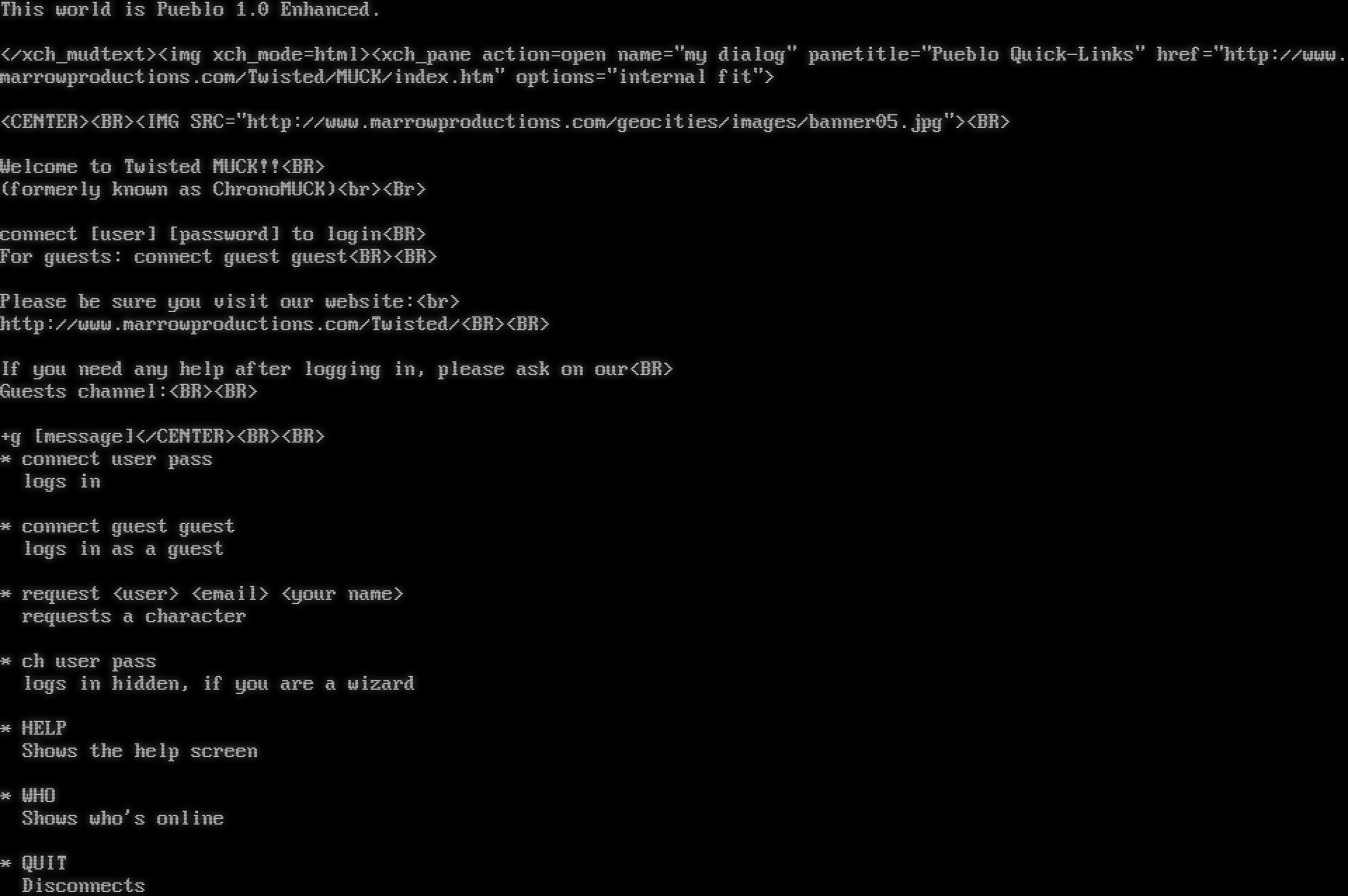 This world is Pueblo 1.0 Enhanced. </xch_mudtext><img xch_mode=html><xch_pane action=open name="my dialog" panetitle="Pueblo Quick-Links" href="http://www.marrowproductions.com/Twisted/MUCK/index.htm" options="internal fit"> <CENTER><BR><IMG SRC="http://www.marrowproductions.com/geocities/images/banner05.jpg"><BR> Welcome to Twisted MUCK!!<BR> (formerly known as ChronoMUCK)<br><Br> connect [user] [password] to login<BR> For guests: connect guest guest<BR><BR> Please be sure you visit our website:<br> http://www.marrowproductions.com/Twisted/<BR><BR> If you need any help after logging in, please ask on our<BR> Guests channel:<BR><BR> +g [message]</CENTER><BR><BR> \* connect user pass logs in \* connect guest guest logs in as a guest \* request <user> <email> <your name> requests a character \* ch user pass logs in hidden, if you are a wizard \* HELP Shows the help screen \* WHO Shows who's online \* QUIT Disconnects