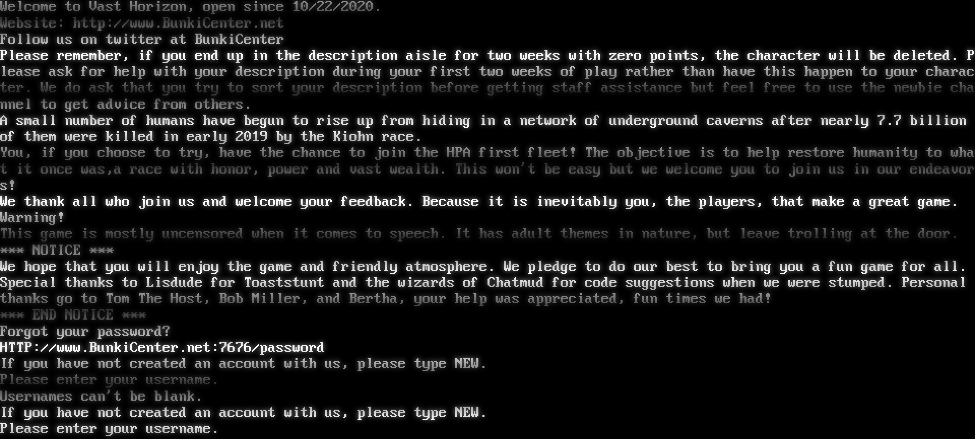 Welcome to Vast Horizon, open since 10/22/2020. Website: http://www.BunkiCenter.net Follow us on twitter at BunkiCenter Please remember, if you end up in the description aisle for two weeks with zero points, the character will be deleted. Please ask for help with your description during your first two weeks of play rather than have this happen to your character. We do ask that you try to sort your description before getting staff assistance but feel free to use the newbie channel to get advice from others. A small number of humans have begun to rise up from hiding in a network of underground caverns after nearly 7.7 billion of them were killed in early 2019 by the Kiohn race. You, if you choose to try, have the chance to join the HPA first fleet! The objective is to help restore humanity to what it once was,a race with honor, power and vast wealth. This won't be easy but we welcome you to join us in our endeavors! We thank all who join us and welcome your feedback. Because it is inevitably you, the players, that make a great game. Warning! This game is mostly uncensored when it comes to speech. It has adult themes in nature, but leave trolling at the door. \*\*\* NOTICE \*\*\* We hope that you will enjoy the game and friendly atmosphere. We pledge to do our best to bring you a fun game for all. Special thanks to Lisdude for Toaststunt and the wizards of Chatmud for code suggestions when we were stumped. Personal thanks go to Tom The Host, Bob Miller, and Bertha, your help was appreciated, fun times we had! \*\*\* END NOTICE \*\*\* Forgot your password? HTTP://www.BunkiCenter.net:7676/password If you have not created an account with us, please type NEW. Please enter your username. Usernames can't be blank. If you have not created an account with us, please type NEW. Please enter your username.