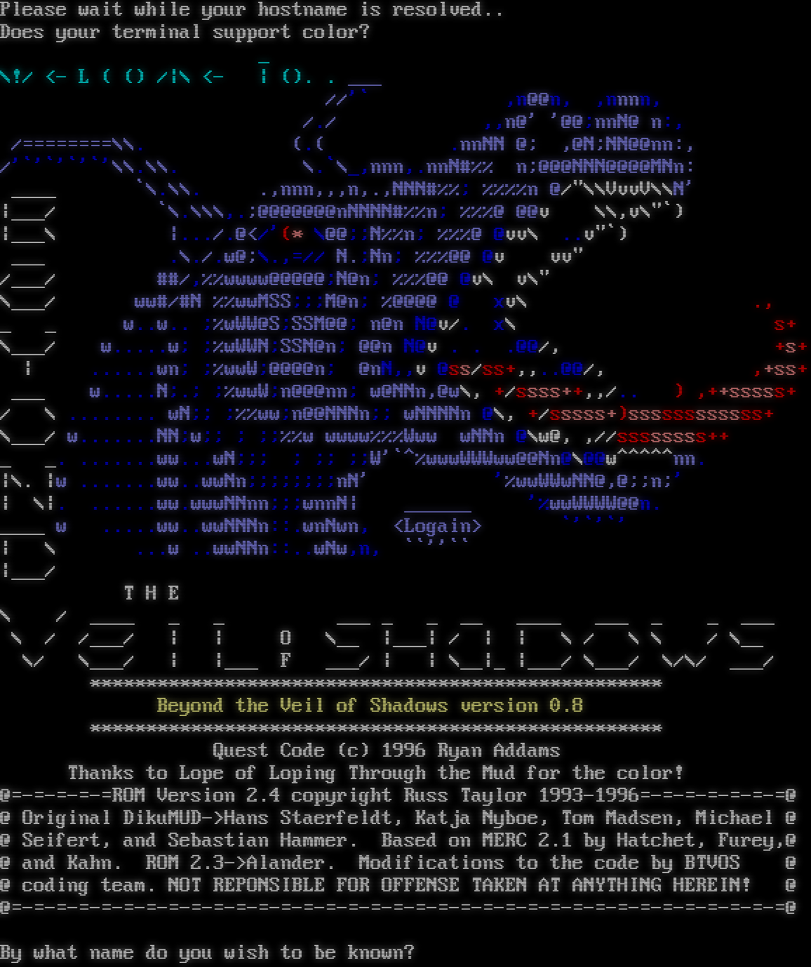 Please wait while your hostname is resolved.. Does your terminal support color? _ \\!/ <- L ( () /\|\\ <- \| (). . ___ //'\` ,n@@n, ,nnnn, /./ ,,n@' '@@;nnN@ n:, /=​=======\\\\. (.( .nnNN @; ,@N;NN@@nn:, /'\`'\`'\`'\`'\\\\.\\\\. \\.\`\\_,nnn,.nnN#%% n;@@@NNN@@@@MNn: _​___ \`\\.\\\\. .,nnn,,,n,.,NNN#%%; %%%%n @/"\\\\VvvV\\\\N' \|___/ \`\\.\\\\\\,.;@@@@@@@nNNNN#%%n; %%%@ @@v \\\\,v\\"\`) \|___\\ \|.../.@</'(\* \\@@;;N%%n; %%%@ @vv\\ ..v"\`) ___ .\\./.w@;\\.,=// N.;Nn; %%%@@ @v vv" /___/ ##/,%%wwww@@@@@;N@n; %%%@@ @v\\ v\\" \\___/ ww#/#N %%wwMSS;;;M@n; %@@@@ @ xv\\ ., _ _ w..w.. ;%wWW@S;SSM@@; n@n N@v/. x\\ s+ \\___/ w.​....w; ;%wWWN;SSN@n; @@n N@v . . .@@/, +s+ \| .​.....wn; ;%wwW;@@@@n; @nN,,v @ss/ss+,,..@@/, ,+ss+ ___ w.​....N;.; ;%wwW;n@@@nn; w@NNn,@w\\, +/ssss++,,/.. ) ,++sssss+ / \\ .​....... wN;; ;%%ww;n@@NNNn;; wNNNNn @\\, +/sssss+)ssssssssssss+ \\___/ w.​......NN;w;; ; ;;%%w wwww%%%Www wNNn @\\w@, ,//ssssssss++ _ _. .​......ww...wN;;; ; ;; ;;W'\`^%wwwWWWww@@Nn@\\@@w^​^^^^nn. \|\\. \|w .​......ww..wwNn;;;;;;;;nN' '%wwWWwNN@,@;;n;' \| \\\|. .​.....ww.wwwNNnn;;;wnnN\| _​_____ '%wwWWWW@@n. _​___ w .​....ww..wwNNNn::.wnNwn, <Logain> \`'\`'\`' \| \\ ...w ..wwNNn::..wNw,n, \`\`''\`\` \|___/ T H E \\ / _​___ _ _ ___ _ _ __ _​___ ___ _ _ ___ \\ / /___/ \| \| O \\__ \|___\| / \| \| \\ / \\ \\ / \\__ \\/ \\___/ \| \|___ F ___/ \| \| \\__\|_ \|___/ \\___/ \\/\\/ ___/ \*\*\*\*\*\*\*\*\*\*\*\*\*\*\*\*\*\*\*\*\*\*\*\*\*\*\*\*\*\*\*\*\*\*\*\*\*\*\*\*\*\*\*\*\*\*\*\*\*\*\* Beyond the Veil of Shadows version 0.8 \*\*\*\*\*\*\*\*\*\*\*\*\*\*\*\*\*\*\*\*\*\*\*\*\*\*\*\*\*\*\*\*\*\*\*\*\*\*\*\*\*\*\*\*\*\*\*\*\*\*\* Quest Code (c) 1996 Ryan Addams Thanks to Lope of Loping Through the Mud for the color! @=​-=-=-=-=ROM Version 2.4 copyright Russ Taylor 1993-1996=​-=-=-=-=-=-=@ @ Original DikuMUD->Hans Staerfeldt, Katja Nyboe, Tom Madsen, Michael @ @ Seifert, and Sebastian Hammer. Based on MERC 2.1 by Hatchet, Furey,@ @ and Kahn. ROM 2.3->Alander. Modifications to the code by BTVOS @ @ coding team. NOT REPONSIBLE FOR OFFENSE TAKEN AT ANYTHING HEREIN! @ @=​-=-=-=-=-=-=-=-=-=-=-=-=-=-=-=-=-=-=-=-=-=-=-=-=-=-=-=-=-=-=-=-=-=-=@ By what name do you wish to be known?