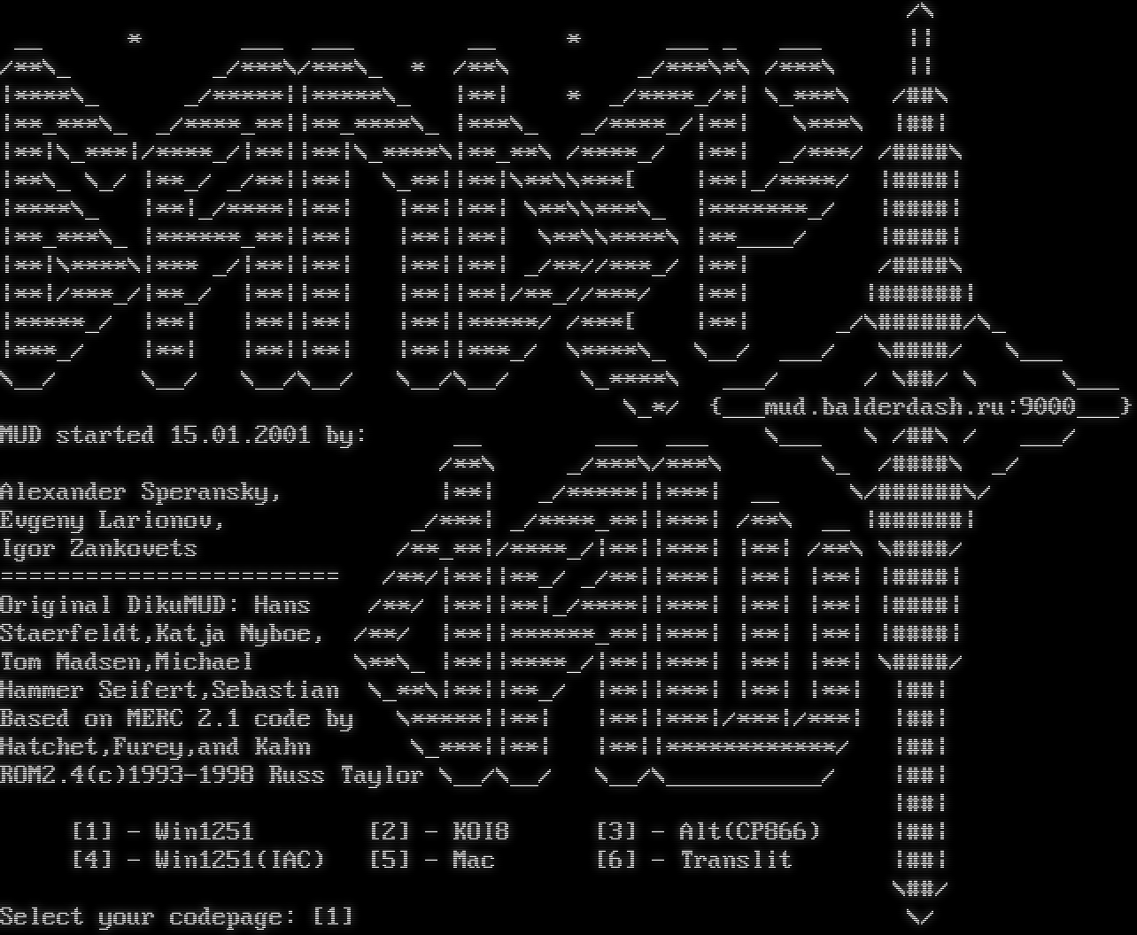 /\\ __ \* ___ ___ __ \* ___ _ ___ \|\| /\*\*\\_ _/\*\*\*\\/\*\*\*\\_ \* /\*\*\\ _/\*\*\*\\\*\\ /\*\*\*\\ \|\| \|\*\*\*\*\\_ _/\*\*\*\*\*\|\|\*\*\*\*\*\\_ \|\*\*\| \* _/\*\*\*\*_/\*\| \\_\*\*\*\\ /##\\ \|\*\*_\*\*\*\\_ _/\*\*\*\*_\*\*\|\|\*\*_\*\*\*\*\\_ \|\*\*\*\\_ _/\*\*\*\*_/\|\*\*\| \\\*\*\*\\ \|##\| \|\*\*\|\\_\*\*\*\|/\*\*\*\*_/\|\*\*\|\|\*\*\|\\_\*\*\*\*\\\|\*\*_\*\*\\ /\*\*\*\*_/ \|\*\*\| _/\*\*\*/ /#​###\\ \|\*\*\\_ \\_/ \|\*\*_/ _/\*\*\|\|\*\*\| \\_\*\*\|\|\*\*\|\\\*\*\\\\\*\*\*[ \|\*\*\|_/\*\*\*\*/ \|#​###\| \|\*\*\*\*\\_ \|\*\*\|_/\*\*\*\*\|\|\*\*\| \|\*\*\|\|\*\*\| \\\*\*\\\\\*\*\*\\_ \|\*\*\*\*\*\*\*_/ \|#​###\| \|\*\*_\*\*\*\\_ \|\*\*\*\*\*\*_\*\*\|\|\*\*\| \|\*\*\|\|\*\*\| \\\*\*\\\\\*\*\*\*\\ \|\*\*_​___/ \|#​###\| \|\*\*\|\\\*\*\*\*\\\|\*\*\* _/\|\*\*\|\|\*\*\| \|\*\*\|\|\*\*\| _/\*\*//\*\*\*_/ \|\*\*\| /#​###\\ \|\*\*\|/\*\*\*_/\|\*\*_/ \|\*\*\|\|\*\*\| \|\*\*\|\|\*\*\|/\*\*_//\*\*\*/ \|\*\*\| \|#​#####\| \|\*\*\*\*\*_/ \|\*\*\| \|\*\*\|\|\*\*\| \|\*\*\|\|\*\*\*\*\*/ /\*\*\*[ \|\*\*\| _/\\#​#####/\\_ \|\*\*\*_/ \|\*\*\| \|\*\*\|\|\*\*\| \|\*\*\|\|\*\*\*_/ \\\*\*\*\*\\_ \\__/ ___/ \\#​###/ \\___ \\__/ \\__/ \\__/\\__/ \\__/\\__/ \\_\*\*\*\*\\ ___/ / \\##/ \\ \\___ \\_\*/ {___mud.balderdash.ru:9000___} MUD started 15.01.2001 by: __ ___ ___ \\___ \\ /##\\ / ___/ /\*\*\\ _/\*\*\*\\/\*\*\*\\ \\_ /#​###\\ _/ Alexander Speransky, \|\*\*\| _/\*\*\*\*\*\|\|\*\*\*\| __ \\/#​#####\\/ Evgeny Larionov, _/\*\*\*\| _/\*\*\*\*_\*\*\|\|\*\*\*\| /\*\*\\ __ \|#​#####\| Igor Zankovets /\*\*_\*\*\|/\*\*\*\*_/\|\*\*\|\|\*\*\*\| \|\*\*\| /\*\*\\ \\#​###/ =​======================= /\*\*/\|\*\*\|\|\*\*_/ _/\*\*\|\|\*\*\*\| \|\*\*\| \|\*\*\| \|#​###\| Original DikuMUD: Hans /\*\*/ \|\*\*\|\|\*\*\|_/\*\*\*\*\|\|\*\*\*\| \|\*\*\| \|\*\*\| \|#​###\| Staerfeldt,Katja Nyboe, /\*\*/ \|\*\*\|\|\*\*\*\*\*\*_\*\*\|\|\*\*\*\| \|\*\*\| \|\*\*\| \|#​###\| Tom Madsen,Michael \\\*\*\\_ \|\*\*\|\|\*\*\*\*_/\|\*\*\|\|\*\*\*\| \|\*\*\| \|\*\*\| \\#​###/ Hammer Seifert,Sebastian \\_\*\*\\\|\*\*\|\|\*\*_/ \|\*\*\|\|\*\*\*\| \|\*\*\| \|\*\*\| \|##\| Based on MERC 2.1 code by \\\*\*\*\*\*\|\|\*\*\| \|\*\*\|\|\*\*\*\|/\*\*\*\|/\*\*\*\| \|##\| Hatchet,Furey,and Kahn \\_\*\*\*\|\|\*\*\| \|\*\*\|\|\*\*\*\*\*\*\*\*\*\*\*\*/ \|##\| ROM2.4(c)1993-1998 Russ Taylor \\__/\\__/ \\__/\\_​__________/ \|##\| \|##\| [1] - Win1251 [2] - KOI8 [3] - Alt(CP866) \|##\| [4] - Win1251(IAC) [5] - Mac [6] - Translit \|##\| \\##/ Select your codepage: [1] \\/