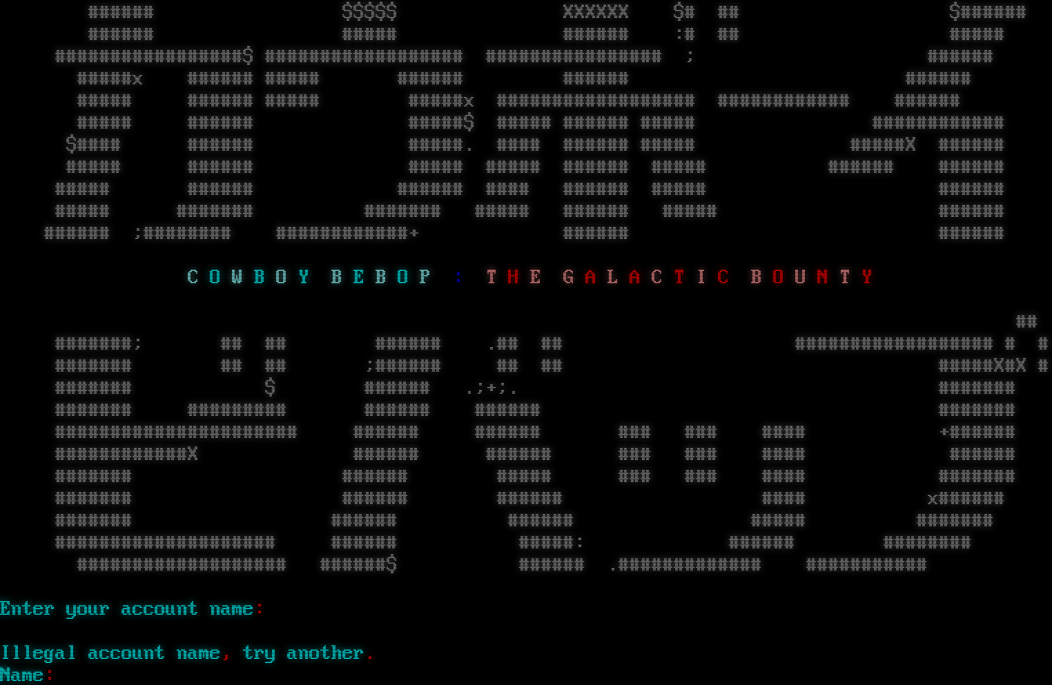 #​##### $$$$$ XXXXXX $# ## $#​##### #​##### #​#### #​##### :# ## #​#### #​################$ #​################# #​############### ; #​##### #​####x #​##### #​#### #​##### #​##### #​##### #​#### #​##### #​#### #​####x #​################# #​########### #​##### #​#### #​##### #​####$ #​#### #​##### #​#### #​########### $#​### #​##### #​####. #​### #​##### #​#### #​####X #​##### #​#### #​##### #​#### #​#### #​##### #​#### #​##### #​##### #​#### #​##### #​##### #​### #​##### #​#### #​##### #​#### #​###### #​###### #​#### #​##### #​#### #​##### #​##### ;#​####### #​###########+ #​##### #​##### C O W B O Y B E B O P : T H E G A L A C T I C B O U N T Y ## #​######; ## ## #​##### .## ## #​################# # # #​###### ## ## ;#​##### ## ## #​####X#X # #​###### $ #​##### .;+;. #​###### #​###### #​######## #​##### #​##### #​###### #​##################### #​##### #​##### ### ### #​### +​###### #​###########X #​##### #​##### ### ### #​### #​##### #​###### #​##### #​#### ### ### #​### #​###### #​###### #​##### #​##### #​### x#​##### #​###### #​##### #​##### #​#### #​###### #​################### #​##### #​####: #​##### #​####### #​################## #​#####$ #​##### .​############# #​########## Enter your account name: Illegal account name, try another. Name: