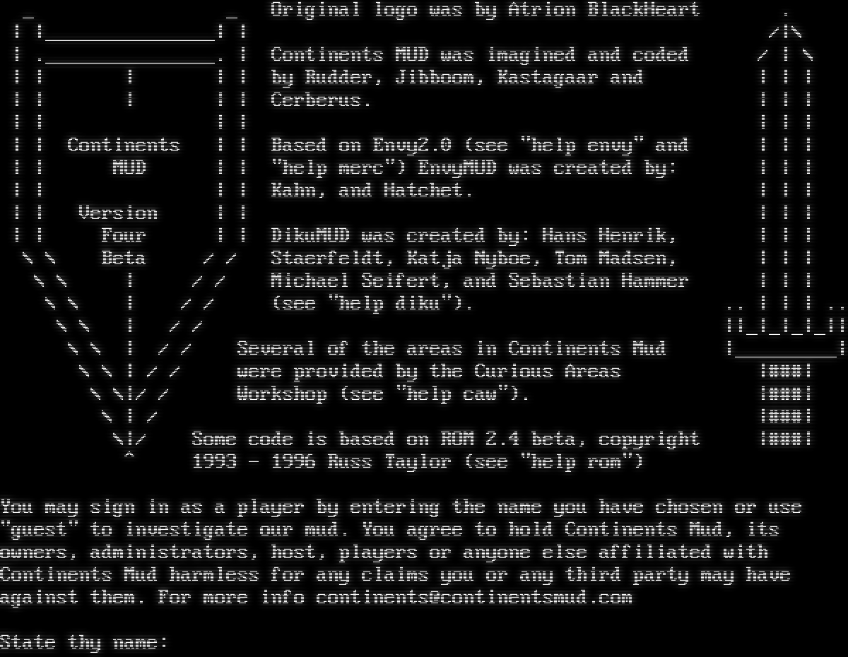 _ _ Original logo was by Atrion BlackHeart . \| \|_​______________\| \| /\|\\ \| .​_______________. \| Continents MUD was imagined and coded / \| \\ \| \| \| \| \| by Rudder, Jibboom, Kastagaar and \| \| \| \| \| \| \| \| Cerberus. \| \| \| \| \| \| \| \| \| \| \| \| Continents \| \| Based on Envy2.0 (see "help envy" and \| \| \| \| \| MUD \| \| "help merc") EnvyMUD was created by: \| \| \| \| \| \| \| Kahn, and Hatchet. \| \| \| \| \| Version \| \| \| \| \| \| \| Four \| \| DikuMUD was created by: Hans Henrik, \| \| \| \\ \\ Beta / / Staerfeldt, Katja Nyboe, Tom Madsen, \| \| \| \\ \\ \| / / Michael Seifert, and Sebastian Hammer \| \| \| \\ \\ \| / / (see "help diku"). .. \| \| \| .. \\ \\ \| / / \|\|_\|_\|_\|_\|\| \\ \\ \| / / Several of the areas in Continents Mud \|_​________\| \\ \\ \| / / were provided by the Curious Areas \|###\| \\ \\\|/ / Workshop (see "help caw"). \|###\| \\ \| / \|###\| \\\|/ Some code is based on ROM 2.4 beta, copyright \|###\| ^ 1993 - 1996 Russ Taylor (see "help rom") You may sign in as a player by entering the name you have chosen or use "guest" to investigate our mud. You agree to hold Continents Mud, its owners, administrators, host, players or anyone else affiliated with Continents Mud harmless for any claims you or any third party may have against them. For more info continents@continentsmud.com State thy name: