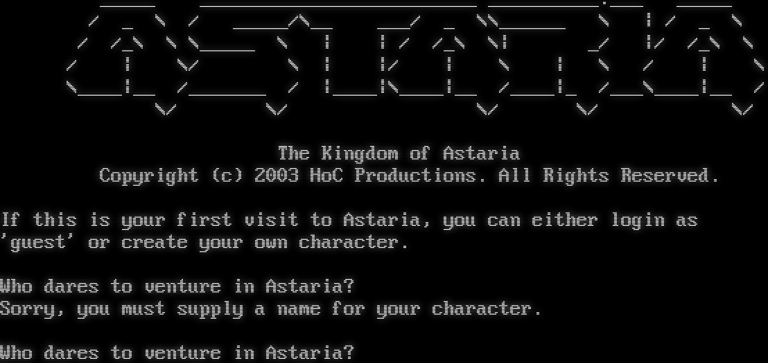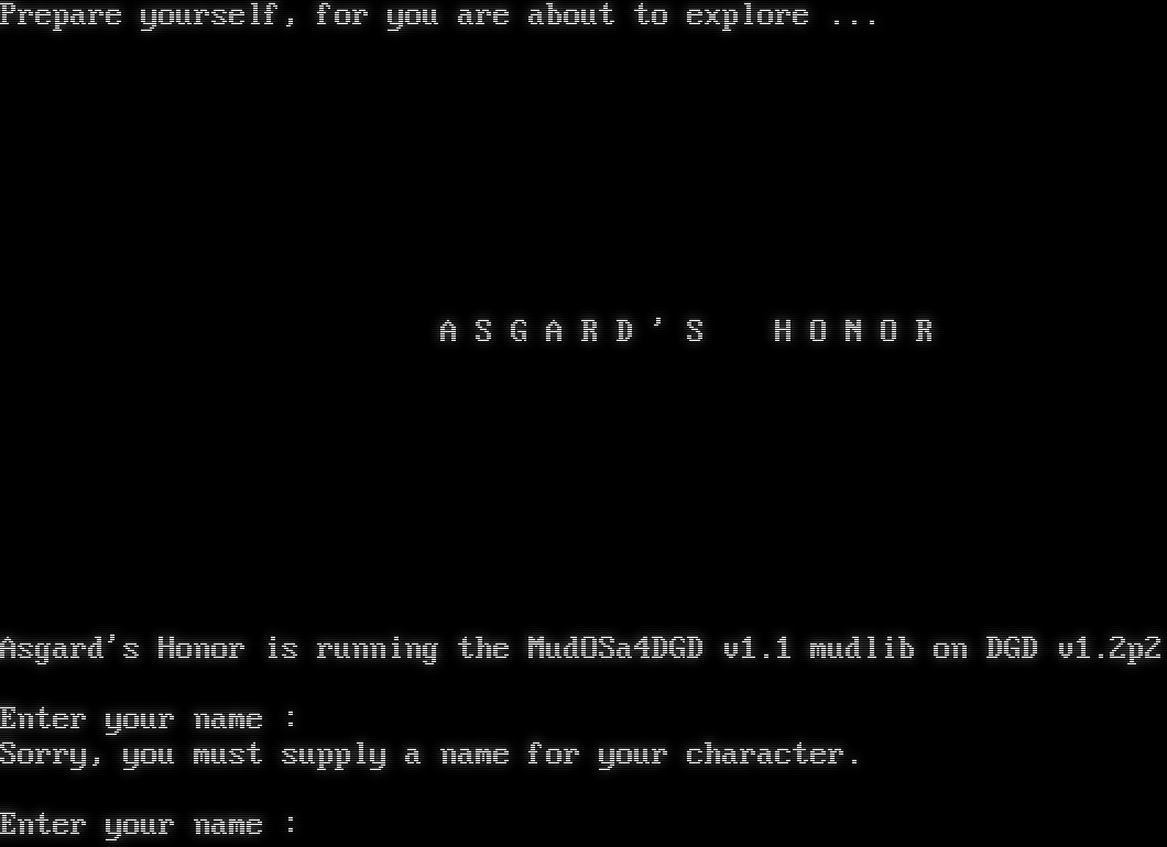 Prepare yourself, for you are about to explore ... A S G A R D ' S H O N O R Asgard's Honor is running the MudOSa4DGD v1.1 mudlib on DGD v1.2p2 Enter your name : Sorry, you must supply a name for your character. Enter your name :