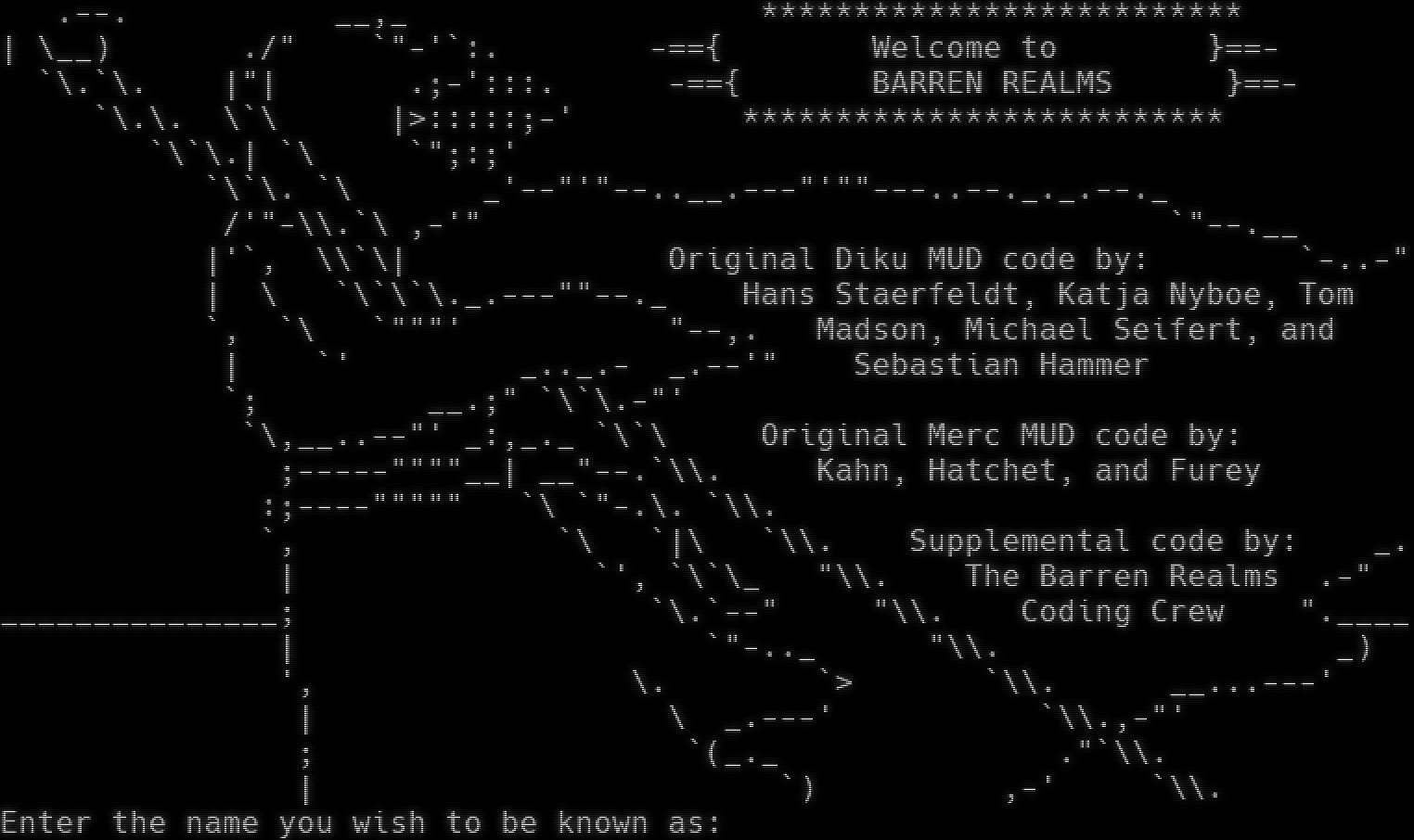 Looking up your internet domain...done. If you have ANY problems logging in, send an email to barren@barrenrealmsmud.com. .​--. __,_ \*\*\*\*\*\*\*\*\*\*\*\*\*\*\*\*\*\*\*\*\*\*\*\*\*\* \| \\__) ./" \`"-'\`:. -=={ Welcome to }==- \`\\.\`\\. \|"\| .;-':::. -=={ BARREN REALMS }==- \`\\.\\. \\\`\\ \|>:::::;-' \*\*\*\*\*\*\*\*\*\*\*\*\*\*\*\*\*\*\*\*\*\*\*\*\*\* \`\\\`\\.\| \`\\ \`";:;' \`\\\`\\. \`\\ _'--"'"​--..__.---"'"​"---..--._._.--._ /'"-\\\\.\`\\ ,-'" \`"​--.__ \|'\`, \\\\\`\\\| Original Diku MUD code by: \`-​..-" \| \\ \`\\\`\\\`\\.​_.---""--._ Hans Staerfeldt, Katja Nyboe, Tom \`, \`\\ \`"""' "--,. Madson, Michael Seifert, and \| \`' _​.._.- _​.--'" Sebastian Hammer \`; __.;" \`\\\`\\.-"' \`\\,_​_..--"' _:,_._ \`\\\`\\ Original Merc MUD code by: ;-​----""""__\| _​_"--.\`\\\\. Kahn, Hatchet, and Furey :;-​---""""" \`\\ \`"-.\\. \`\\\\. \`, \`\\ \`\|\\ \`\\\\. Supplemental code by: _. \| \`', \`\\\`\\_ "\\\\. The Barren Realms .-" _​______________; \`\\.\`--" "\\\\. Coding Crew "​.____ \| \`"​-.._ "\\\\. _) ', \\. \`> \`\\\\. _​_...---' \| \\ _​.---' \`\\\\.,-"' ; \`(_._ ."\`\\\\. \| \`) ,-' \`\\\\. Enter the name you wish to be known as: