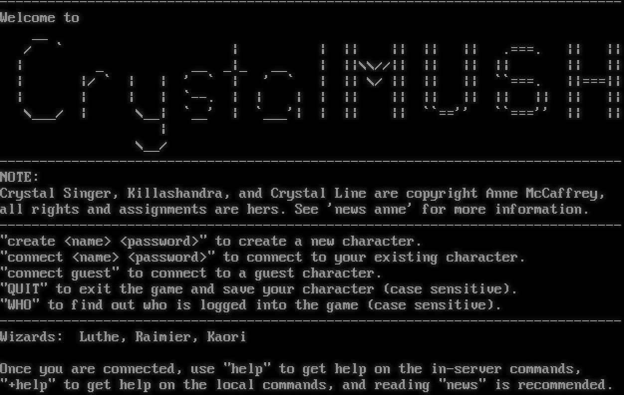-​----------------------------------------------------------------------------- Welcome to __ / \` \| \| \|\| \|\| \|\| \|\| .​===. \|\| \|\| \| _ __ _\|_ __ \| \|\|\\\\//\|\| \|\| \|\| \|\| \|\| \|\| \| \|/ \` \| \| ' \` \| ' \` \| \|\| \\/ \|\| \|\| \|\| \`\`=​==. \|\|===\|\| \| \| \| \| \`--. \| \| \| \| \|\| \|\| \|\| \|\| \|\| \|\| \|\| \|\| \\___/ \| \\__\| \`__' \| \`___'\| \| \|\| \|\| \`\`=='' \`\`==='' \|\| \|\| \| \\__/ -​----------------------------------------------------------------------------- NOTE: Crystal Singer, Killashandra, and Crystal Line are copyright Anne McCaffrey, all rights and assignments are hers. See 'news anne' for more information. -​----------------------------------------------------------------------------- "create <name> <password>" to create a new character. "connect <name> <password>" to connect to your existing character. "connect guest" to connect to a guest character. "QUIT" to exit the game and save your character (case sensitive). "WHO" to find out who is logged into the game (case sensitive). -​----------------------------------------------------------------------------- Wizards: Luthe, Raimier, Kaori Once you are connected, use "help" to get help on the in-server commands, "+help" to get help on the local commands, and reading "news" is recommended.
