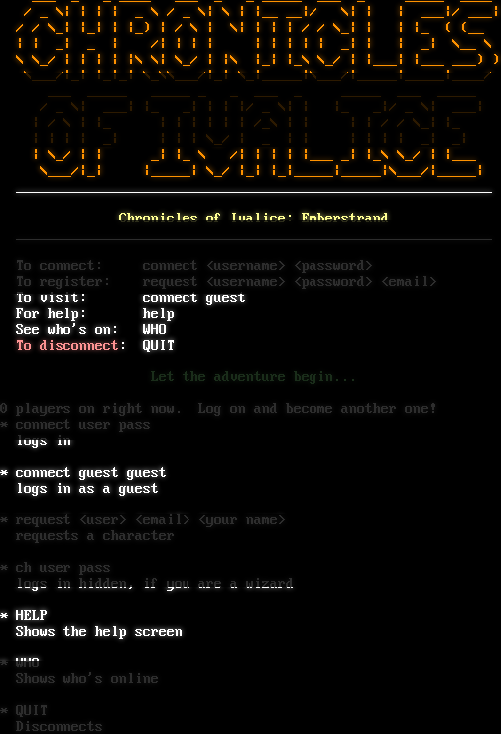 ___ _ _ _​___ ___ _ _ _​____ ___ _ _​____ _​___ / _ \\\| \| \| \| _ \\ / _ \\\| \\ \| \|__ __\|/ \\\| \| \| ___\|/ ___\| / / \\_\| \|_\| \| \|_) \| / \\ \| \\\| \| \| \| / / \\_\| \| \| \|_ ( (__ \| \| _\| _ \| /\| \| \| \| \| \| \| \| \| _\| \| \| _\| \\__ \\ \\ \\_/ \| \| \| \| \|\\ \\\| \\_/ \| \|\\ \|_\| \|_\\ \\_/ \| \|___\| \|___ ___) ) \\___/\|_\| \|_\|_\| \\_\\\\___/\|_\| \\_\|_​____\|\\___/\|_​____\|_​____\|_​___/ ___ _​____ _​____ _ _ ___ _ _​____ ___ _​____ / _ \\\| ___\| \|_ _\| \| \| \|/ _ \\\| \| \|_ _\|/ _ \\\| ___\| \| / \\ \| \|_ \| \| \| \| \| \| /_\\ \| \| \| \| / / \\_\| \|_ \| \| \| \| _\| \| \| \| \\_/ \| _ \| \| \| \| \| \| _\| _\| \| \\_/ \| \| _\| \|_ \\ /\| \| \| \| \|___ _\| \|_\\ \\_/ \| \|___ \\___/\|_\| \|_​____\| \\_/ \|_\| \|_\|_​____\|_​____\|\\___/\|_​____\| _​___________________________________________________________ Chronicles of Ivalice: Emberstrand _​___________________________________________________________ To connect: connect <username> <password> To register: request <username> <password> <email> To visit: connect guest For help: help See who's on: WHO To disconnect: QUIT Let the adventure begin... 0 players on right now. Log on and become another one! \* connect user pass logs in \* connect guest guest logs in as a guest \* request <user> <email> <your name> requests a character \* ch user pass logs in hidden, if you are a wizard \* HELP Shows the help screen \* WHO Shows who's online \* QUIT Disconnects