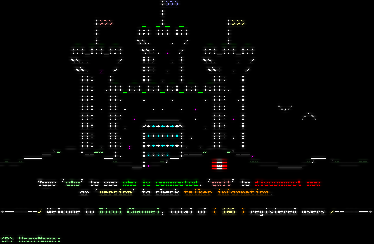\|>>> \| \|>>> _ _\|_ _ \|>>> \| \|;\| \|;\| \|;\| \| _ _\|_ _ \\\\. . / _ _\|_ _ \|;\|_\|;\|_\|;\| \\\\:. , / \|;\|_\|;\|_\|;\| \\\\.. / \|\|; . \| \\\\. . / \\\\. , / \|\|: . \| \\\\: . / \|\|: \|_ _ \|\|_ . _ \| _ _\|\|: \| \|\|: .\|\|\|_\|;\|_\|;\|_\|;\|_\|;\|_\|;\|\|:. \| \|\|: \|\|. . . . \|\|: .\| \|\|: . \|\| . . . . , \|\|: \| \\,/ \|\|: \|\|: , _​______ . \|\|: , \| /\`\\ \|\|: \|\| . /+​++++++\\ . \|\|: \| \|\|: \|\|. \|+​++++++\| . \|\|: . \| __ \|\|: . \|\|: , \|+​++++++\|. . _\|\|_ \| _​___--\`~ '-​-~~__\|. \|+​++++__\|-​---~ ~\`---, ___ -​~--~ ~​---__\|,--~' \* ~​~----_____-~' \`~​----~~ Type 'who' to see who is connected, 'quit' to disconnect now or 'version' to check talker information. +​--===--/ Welcome to Bicol Channel, total of ( 106 ) registered users /-​-===--+ <@> UserName: