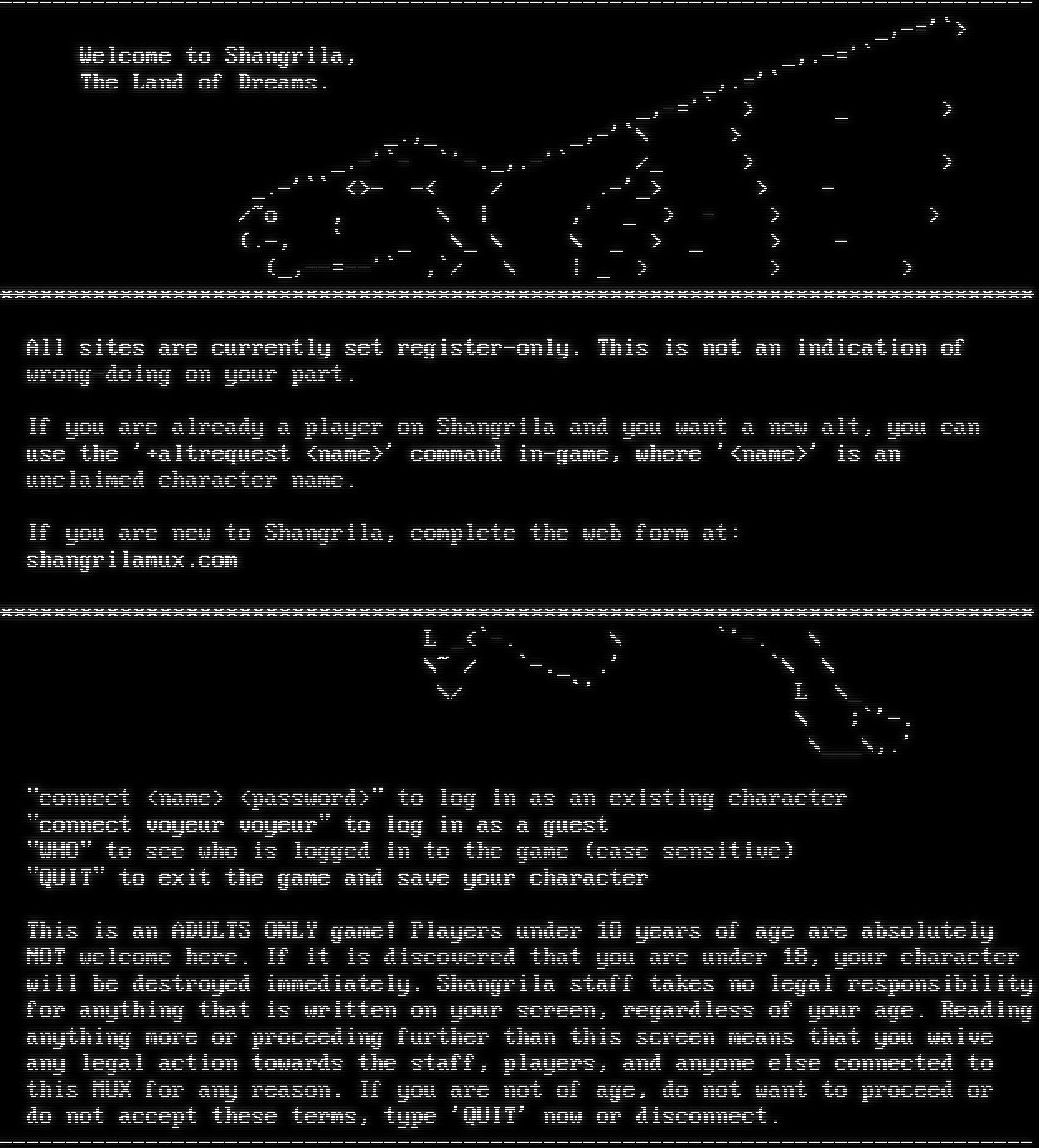 -​----------------------------------------------------------------------------- _,-='\`> Welcome to Shangrila, _,.-='\` The Land of Dreams. _,.='\` _,-='\` > _ > _.,_ _,-'\`\\ > _.-'\`- \`'-._,.-'\` /_ > > _.-'\`\` <>- -< / .-'_> > - /~o , \\ \| ,' _ > - > > (.-, \` _ \\_ \\ \\ _ > _ > - (_,-​-=--'\` ,\`/ \\ \| _ > > > \*\*\*\*\*\*\*\*\*\*\*\*\*\*\*\*\*\*\*\*\*\*\*\*\*\*\*\*\*\*\*\*\*\*\*\*\*\*\*\*\*\*\*\*\*\*\*\*\*\*\*\*\*\*\*\*\*\*\*\*\*\*\*\*\*\*\*\*\*\*\*\*\*\*\*\*\*\* All sites are currently set register-only. This is not an indication of wrong-doing on your part. If you are already a player on Shangrila and you want a new alt, you can use the '+altrequest <name>' command in-game, where '<name>' is an unclaimed character name. If you are new to Shangrila, complete the web form at: shangrilamux.com \*\*\*\*\*\*\*\*\*\*\*\*\*\*\*\*\*\*\*\*\*\*\*\*\*\*\*\*\*\*\*\*\*\*\*\*\*\*\*\*\*\*\*\*\*\*\*\*\*\*\*\*\*\*\*\*\*\*\*\*\*\*\*\*\*\*\*\*\*\*\*\*\*\*\*\*\*\* L _<\`-. \\ \`'-. \\ \\~ / \`-._ .' \`\\ \\ \\/ \`' L \\_ \\ ;\`'-. \\___\\,.' "connect <name> <password>" to log in as an existing character "connect voyeur voyeur" to log in as a guest "WHO" to see who is logged in to the game (case sensitive) "QUIT" to exit the game and save your character This is an ADULTS ONLY game! Players under 18 years of age are absolutely NOT welcome here. If it is discovered that you are under 18, your character will be destroyed immediately. Shangrila staff takes no legal responsibility for anything that is written on your screen, regardless of your age. Reading anything more or proceeding further than this screen means that you waive any legal action towards the staff, players, and anyone else connected to this MUX for any reason. If you are not of age, do not want to proceed or do not accept these terms, type 'QUIT' now or disconnect. -​-----------------------------------------------------------------------------