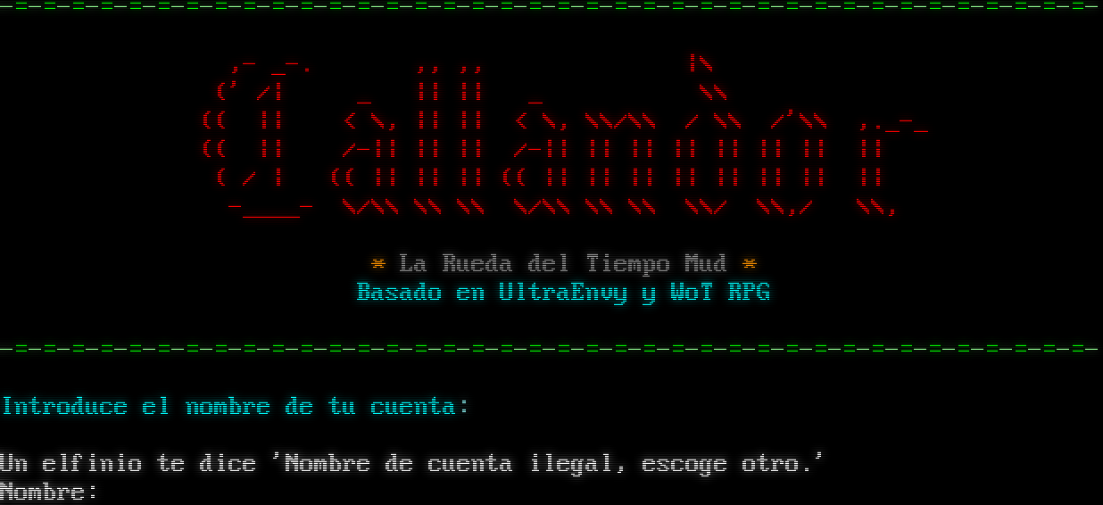 -​=-=-=-=-=-=-=-=-=-=-=-=-=-=-=-=-=-=-=-=-=-=-=-=-=-=-=-=-=-=-=-=-=-=-=-=-=-=- ,- _-. ,, ,, \|\\ (' /\| _ \|\| \|\| _ \\\\ (( \|\| < \\, \|\| \|\| < \\, \\\\/\\\\ / \\\\ /'\\\\ ,.​_-_ (( \|\| /-\|\| \|\| \|\| /-\|\| \|\| \|\| \|\| \|\| \|\| \|\| \|\| ( / \| (( \|\| \|\| \|\| (( \|\| \|\| \|\| \|\| \|\| \|\| \|\| \|\| -​____- \\/\\\\ \\\\ \\\\ \\/\\\\ \\\\ \\\\ \\\\/ \\\\,/ \\\\, \* La Rueda del Tiempo Mud \* Basado en UltraEnvy y WoT RPG -​=-=-=-=-=-=-=-=-=-=-=-=-=-=-=-=-=-=-=-=-=-=-=-=-=-=-=-=-=-=-=-=-=-=-=-=-=-=- Introduce el nombre de tu cuenta: Un elfinio te dice 'Nombre de cuenta ilegal, escoge otro.' Nombre: