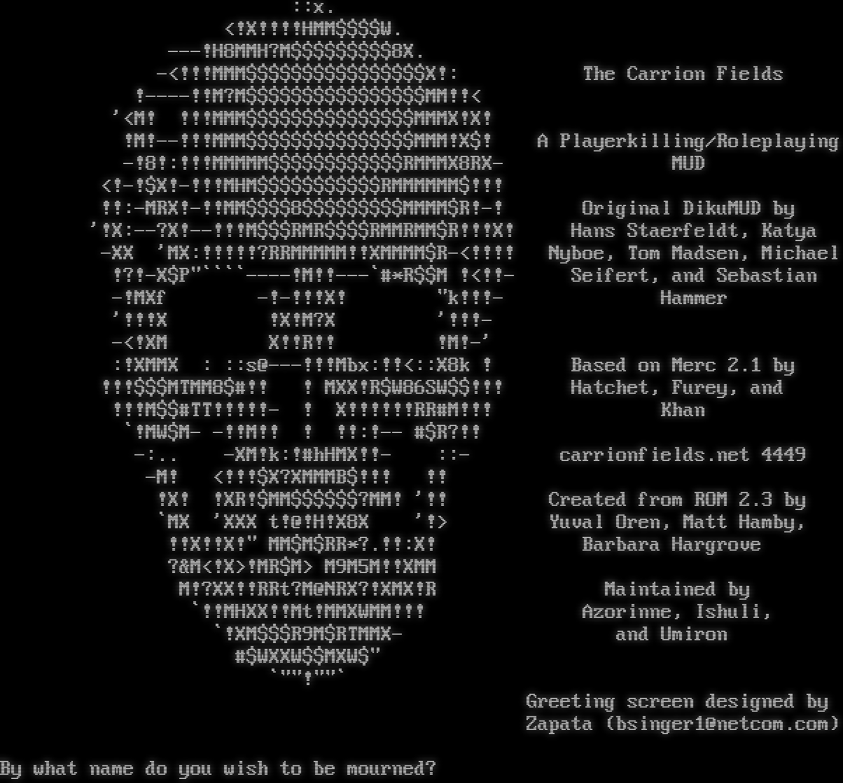 ::x. <!X!!!!HMM$$$$W. ---!H8MMH?M$$$$$$$$$8X. -<!!!MMM$$$$$$$$$$$$$$$$X!: The Carrion Fields !-​---!!M?M$$$$$$$$$$$$$$$$MM!!< '<M! !!!MMM$$$$$$$$$$$$$$$MMMX!X! !M!--!!!MMM$$$$$$$$$$$$$$$MMM!X$! A Playerkilling/Roleplaying -!8!:!!!MMMMM$$$$$$$$$$$$RMMMX8RX- MUD <!-!$X!-!!!MHM$$$$$$$$$$$RMMMMMM$!!! !!:-MRX!-!!MM$$$$8$$$$$$$$$MMMM$R!-! Original DikuMUD by '!X:--?X!--!!!M$$$RMR$$$$RMMRMM$R!!!X! Hans Staerfeldt, Katya -XX 'MX:!!!!!?RRMMMMM!!XMMMM$R-<!!!! Nyboe, Tom Madsen, Michael !?!-X$P"\`\`\`\`-​---!M!!---\`#\*R$$M !<!!- Seifert, and Sebastian -!MXf -!-!!!X! "k!!!- Hammer '!!!X !X!M?X '!!!- -<!XM X!!R!! !M!-' :!XMMX : ::s@---!!!Mbx:!!<::X8k ! Based on Merc 2.1 by !!!$$$MTMM8$#!! ! MXX!R$W86SW$$!!! Hatchet, Furey, and !!!M$$#TT!!!!!- ! X!!!!!!RR#M!!! Khan \`!MW$M- -!!M!! ! !!:!-- #$R?!! -:.. -XM!k:!#hHMX!!- ::- carrionfields.net 4449 -M! <!!!$X?XMMMB$!!! !! !X! !XR!$MM$$$$$$?MM! '!! Created from ROM 2.3 by \`MX 'XXX t!@!H!X8X '!> Yuval Oren, Matt Hamby, !!X!!X!" MM$M$RR\*?.!!:X! Barbara Hargrove ?&M<!X>!MR$M> M9M5M!!XMM M!?XX!!RRt?M@NRX?!XMX!R Maintained by \`!!MHXX!!Mt!MMXWMM!!! Azorinne, Ishuli, \`!XM$$$R9M$RTMMX- and Umiron #$WXXW$$MXW$" \`""!""\` Greeting screen designed by Zapata (bsinger1@netcom.com) By what name do you wish to be mourned?