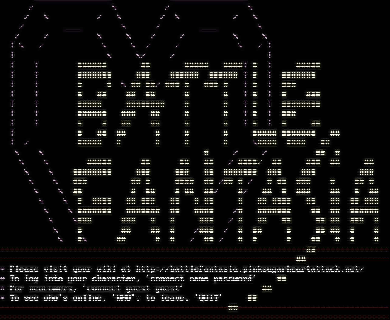 _​_______________ _​_______________ / \\ / \\ / \\ / \\ / \\ / \\ / _​___ \\ / _​___ \\ / / \\ \\ / / \\ \\ \| \\ / \\ \\ / / \\ / \| \| \\ \\/ / \| \| \| #​##### ## #​#### #​###\| # \| #​#### \| \| #​###### ### #​##### #​##### \| # \| #​###### \| \| # # \\ ## ##/ ### # ### # \| # \| ### \| \| # ## ## ## # # \| # \| # ### \| \| #​#### #​####### # # \| # \| #​####### \| \| #​##### ### ## # # \| # \| ### \| \| # # ## ## # # \| # \| # ## \| # ## ## # # # #​#### #​###### ## \| / #​#### # # # # \\#​### #​### ## \\ \\ # / / ## # \\ \\ #​#### ## ## ## / #​###/ ## ### ## ## \\ \\ #​####### ### ### ## #​###### ### ### ### \\ \\ ### ## # #​### ## /## # / # ## ### # ## # \\ \\ ## # ## # ## ##/ #/ ## # ### ## # ## \\ \\ # #​### ## ### ## # ## # ## #​### ## ## ## ### \\ \\ #​###### #​###### ## #​### /# #​###### ## ## #​##### \\ \\### ### # # ### / # ## ## ## ## ### # \\ # ## ## # /### / # ## # ## ## # # \\ #\\ ## # # / ## / # # # ## # # # =​==============================================================##=============== -​------------------------------------------------------------##----------------- \* Please visit your wiki at http://battlefantasia.pinksugarheartattack.net/ \* To log into your character, 'connect name password' ## \* For newcomers, 'connect guest guest' ## \* To see who's online, 'WHO'; to leave, 'QUIT' ## -​----------------------------------------------##------------------------------- =​===============================================================================