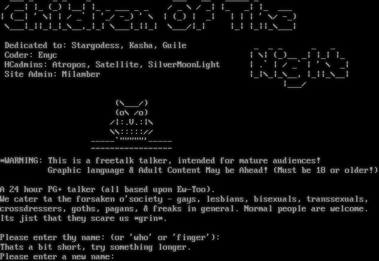 ___ _ _ _ _ ___ __ _​____ _ / __\| \|_ (_) \|__\| \|_ _ ___ _ _ / _ \\ / _\| \|_ _\| \|_ ___ \| (__\| ' \\\| \| / _\` \| '_/ -_) ' \\ \| (_) \| _\| \| \| \| ' \\/ -_) \\___\|_\|\|_\|_\|_\\__,_\|_\| \\___\|_\|\|_\| \\___/\|_\| \|_\| \|_\|\|_\\___\| Dedicated to: Stargodess, Kasha, Guile _ _ _ _ _ Coder: Enyc \| \\\| (_)__ _\| \|_\| \|_ HCadmins: Atropos, Satellite, SilverMoonLight \| .\` \| / _\` \| ' \\ _\| Site Admin: Milamber \|_\|\\_\|_\\__, \|_\|\|_\\__\| \|___/ (\\___/) (o\\ /o) /\|:.V.:\|\\ \\\\:::::// -​----\`"​""""'-​---- ~​~~~~~~~~~~~~~~~~ \*WARNING: This is a freetalk talker, intended for mature audiences! Graphic language & Adult Content May be Ahead! (Must be 18 or older!) A 24 hour PG+ talker (all based upon Ew-Too). We cater ta the forsaken o'society - gays, lesbians, bisexuals, transsexuals, crossdressers, goths, pagans, & freaks in general. Normal people are welcome. Its jist that they scare us \*grin\*. Please enter thy name: (or 'who' or 'finger'): Thats a bit short, try something longer. Please enter a new name: