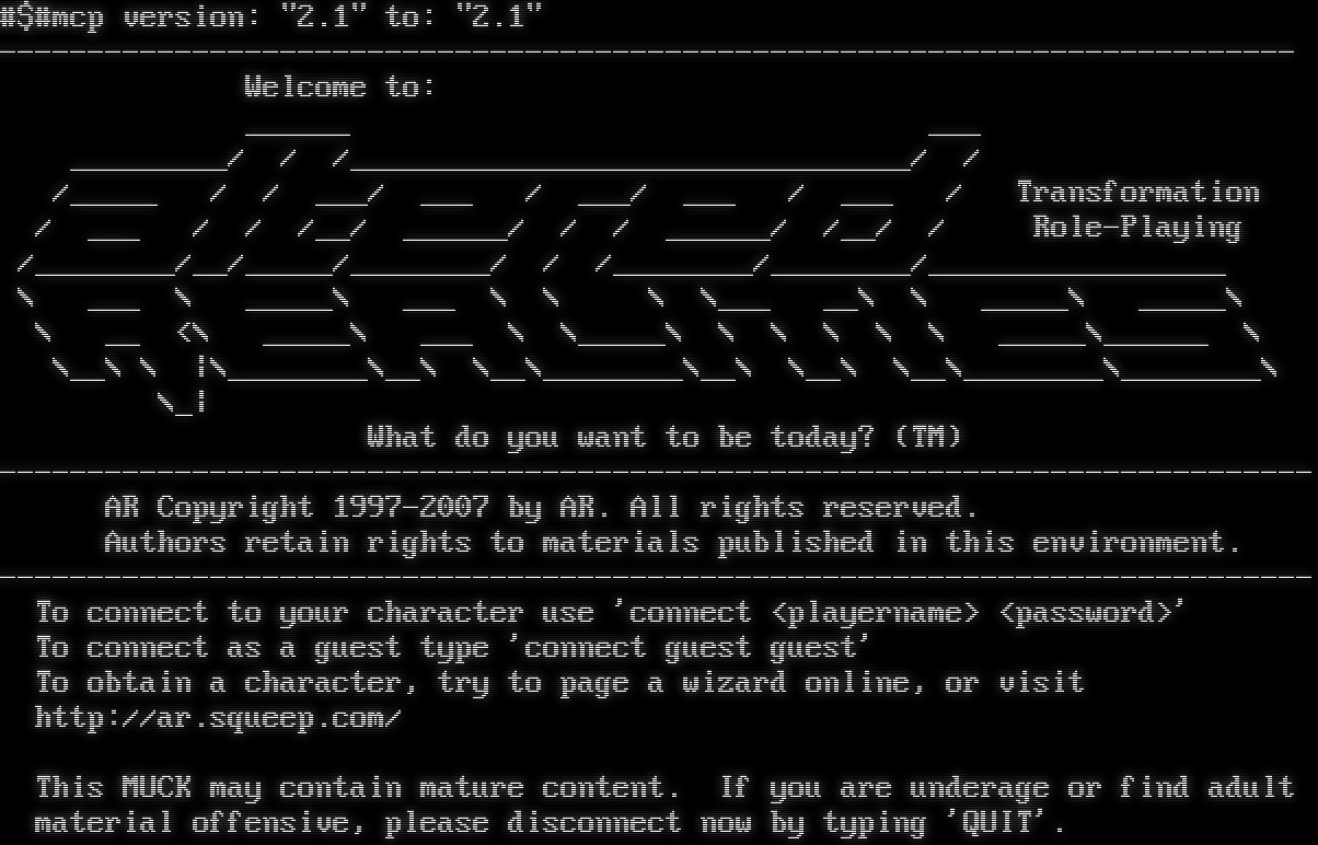 #$#mcp version: "2.1" to: "2.1" -​------------------------------------------------------------------------- Welcome to: _​_____ ___ _​________/ / /_​_______________________________/ / /_​____ / / ___/ ___ / ___/ ___ / ___ / Transformation / ___ / / /__/ _​_____/ / / _​_____/ /__/ / Role-Playing /_​_______/__/_​____/_​_______/ / /_​_______/_​_______/_​________________ \\ ___ \\ _​____\\ ___ \\ \\ \\ \\___ __\\ \\ _​____\\ _​____\\ \\ __ <\\ _​____\\ ___ \\ \\_​____\\ \\ \\ \\ \\ \\ _​____\\_​_____ \\ \\__\\ \\ \|\\_​_______\\__\\ \\__\\_​_______\\__\\ \\__\\ \\__\\_​_______\\_​_______\\ \\_\| What do you want to be today? (TM) -​-------------------------------------------------------------------------- AR Copyright 1997-2007 by AR. All rights reserved. Authors retain rights to materials published in this environment. -​-------------------------------------------------------------------------- To connect to your character use 'connect <playername> <password>' To connect as a guest type 'connect guest guest' To obtain a character, try to page a wizard online, or visit http://ar.squeep.com/ This MUCK may contain mature content. If you are underage or find adult material offensive, please disconnect now by typing 'QUIT'.