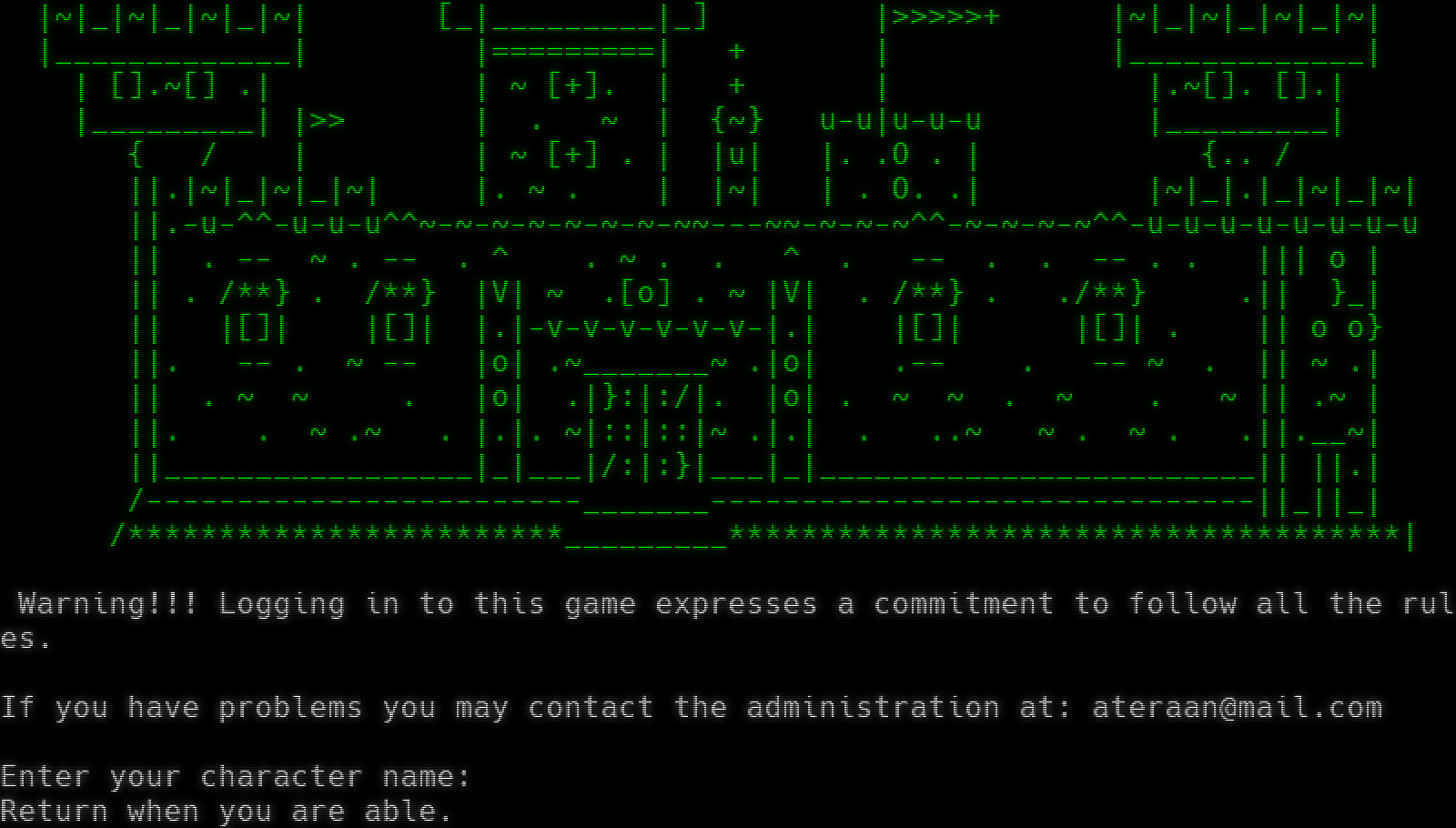 N E W W O R L D S A T E R A A N fantasy adventure \|>>>+ \|~\|_\|~\|_\|~\| \|>>>+ \| _\|-​--------\|_ . \| \|~\|_\|~\|_\|~\|_\|~\| [_\|_​________\|_] \|>>>>>+ \|~\|_\|~\|_\|~\|_\|~\| \|_​____________\| \|=​========\| + \| \|_​____________\| \| [].~[] .\| \| ~ [+]. \| + \| \|.~[]. [].\| \|_​________\| \|>> \| . ~ \| {~} u-u\|u-u-u \|_​________\| { / \| \| ~ [+] . \| \|u\| \|. .O . \| {.. / \|\|.\|~\|_\|~\|_\|~\| \|. ~ . \| \|~\| \| . O. .\| \|~\|_\|.\|_\|~\|_\|~\| \|\|.-u-​^^-u-u-u^​^~-~-~-~-~-~-~-~~---~~-~-~-~^^-~-~-~-~^^-u-u-u-u-u-u-u-u \|\| . -- ~ . -- . ^ . ~ . . ^ . -- . . -- . . \|\|\| o \| \|\| . /\*\*} . /\*\*} \|V\| ~ .[o] . ~ \|V\| . /\*\*} . ./\*\*} .\|\| }_\| \|\| \|[]\| \|[]\| \|.\|-v-v-v-v-v-v-\|.\| \|[]\| \|[]\| . \|\| o o} \|\|. -- . ~ -- \|o\| .​~_______~ .\|o\| .-- . -- ~ . \|\| ~ .\| \|\| . ~ ~ . \|o\| .\|}:\|:/\|. \|o\| . ~ ~ . ~ . ~ \|\| .~ \| \|\|. . ~ .~ . \|.\|. ~\|::\|::\|~ .\|.\| . ..~ ~ . ~ . .\|\|.​__~\| \|\|_​________________\|_\|___\|/:\|:}\|___\|_\|_​_______________________\|\| \|\|.\| /-​-----------------------_______------------------------------\|\|_\|\|_\| /\*\*\*\*\*\*\*\*\*\*\*\*\*\*\*\*\*\*\*\*\*\*\*\*_​________\*\*\*\*\*\*\*\*\*\*\*\*\*\*\*\*\*\*\*\*\*\*\*\*\*\*\*\*\*\*\*\*\*\*\*\*\*\| Warning!!! Logging in to this game expresses a commitment to follow all the rules. If you have problems you may contact the administration at: ateraan@mail.com Enter your character name: Return when you are able.