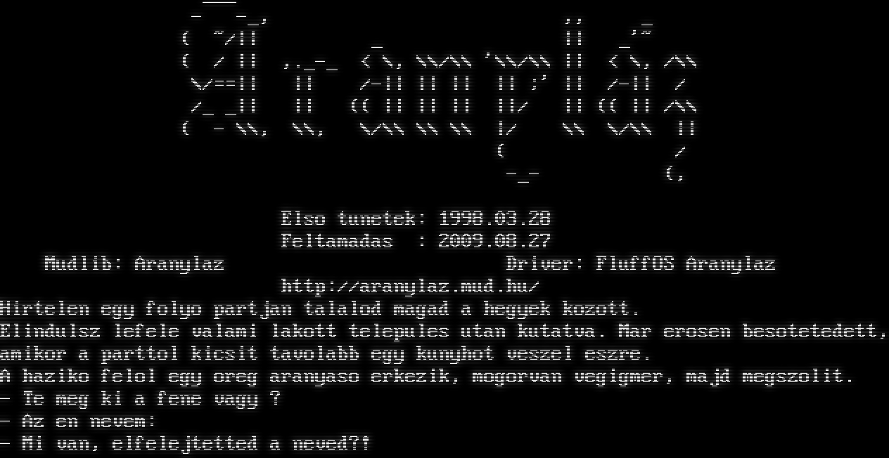 ___ - -_, ,, _ ( ~/\|\| _ \|\| _'~ ( / \|\| ,.​_-_ < \\, \\\\/\\\\ '\\\\/\\\\ \|\| < \\, /\\\\ \\/==\|\| \|\| /-\|\| \|\| \|\| \|\| ;' \|\| /-\|\| / /_ _\|\| \|\| (( \|\| \|\| \|\| \|\|/ \|\| (( \|\| /\\\\ ( - \\\\, \\\\, \\/\\\\ \\\\ \\\\ \|/ \\\\ \\/\\\\ \|\| ( / -_- (, Elso tunetek: 1998.03.28 Feltamadas : 2009.08.27 Mudlib: Aranylaz Driver: FluffOS Aranylaz http://aranylaz.mud.hu/ Hirtelen egy folyo partjan talalod magad a hegyek kozott. Elindulsz lefele valami lakott telepules utan kutatva. Mar erosen besotetedett, amikor a parttol kicsit tavolabb egy kunyhot veszel eszre. A haziko felol egy oreg aranyaso erkezik, mogorvan vegigmer, majd megszolit. - Te meg ki a fene vagy ? - Az en nevem: - Mi van, elfelejtetted a neved?!