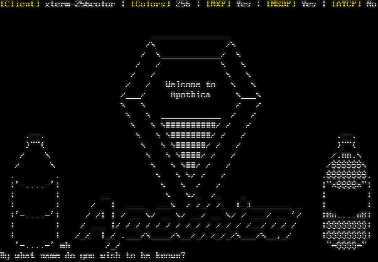 Attempting to Detect Client, Please Wait... [Client] xterm-256color \| [Colors] 256 \| [MXP] Yes \| [MSDP] Yes \| [ATCP] No _​_______________ /\\ /\\ / \\_​___________/ \\ / / \\ \\ / / \\ \\ / / Welcome to \\ \\ /___/ Apothica \\___\\ \\ \\ / / \\ \\ _​___________ / / \\ \\ \\#​#########/ / / ,--, \\ \\ \\#​#######/ / / ,--, )""( \\ \\ \\#​#####/ / / )""( / \\ \\ \\ \\#​###/ / / /.nn.\\ / \\ \\ \\ \\##/ / / /$$$$$$\\ . . \\ \\ \\/ / / .$$$$$$$$. \|'-​....-'\| \\ \\ / / \|"\*$$$$\*"\| \| \| __ \\ \\/_ /_ _ \| \| \| \| / \| _​___ ___\\ / /_/ /_ (_)_​_______ _ \| \| \|'-​....-'\| / /\| \| / __ \\/ __ \\/ __/ __ \\/ / ___/ __ '/ \|8n.​...n8\| \| \| / ___ \|/ /_/ / /_/ / /_/ / / / / /__/ /_/ / \|$$$$$$$$\| \| \| /_/ \|_/ .​___/\\_​___/\\__/_/ /_/_/\\___/\\__,_/ \|$$$$$$$$\| '-​....-' mh /_/ "\*$$$$\*" By what name do you wish to be known?