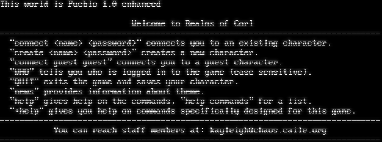 This world is Pueblo 1.0 enhanced Welcome to Realms of Corl -​----------------------------------------------------------------------------- "connect <name> <password>" connects you to an existing character. "create <name> <password>" creates a new character. "connect guest guest" connects you to a guest character. "WHO" tells you who is logged in to the game (case sensitive). "QUIT" exits the game and saves your character. "news" provides information about theme. "help" gives help on the commands, "help commands" for a list. "+help" gives you help on commands specifically designed for this game. -​----------------------------------------------------------------------------- You can reach staff members at: kayleigh@chaos.caile.org -​-----------------------------------------------------------------------------