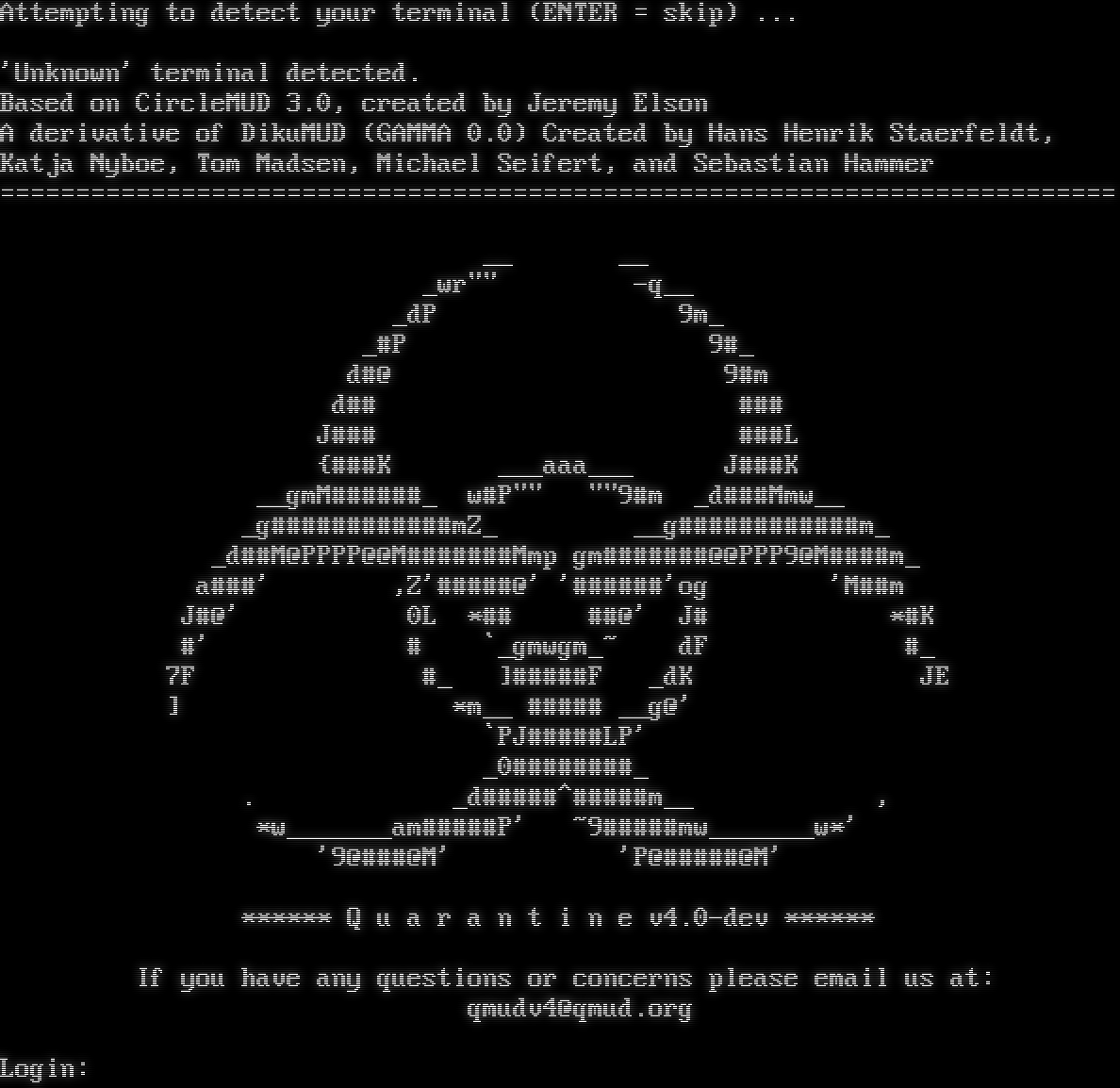 Attempting to detect your terminal (ENTER = skip) ... 'Unknown' terminal detected. Based on CircleMUD 3.0, created by Jeremy Elson A derivative of DikuMUD (GAMMA 0.0) Created by Hans Henrik Staerfeldt, Katja Nyboe, Tom Madsen, Michael Seifert, and Sebastian Hammer =​========================================================================= __ __ _wr"" -q__ _dP 9m_ _#P 9#_ d#@ 9#m d## ### J### ###L {###K ___aaa___ J###K __gmM#​#####_ w#P"" ""9#m _d###Mmw__ _g#​###########mZ_ __g#​###########m_ _d##M@PPPP@@M#​######Mmp gm#​######@@PPP9@M#​###m_ a###' ,Z'#​####@' '#​#####'og 'M##m J#@' 0L \*## ##@' J# \*#K #' # \`_gmwgm_~ dF #_ 7F #_ ]#​####F _dK JE ] \*m__ #​#### __g@' \`PJ#​####LP' _0#​#######_ . _d#​####^#####m__ , \*w_​______am#​####P' ~9#​####mw_​______w\*' '9@###@M' 'P@#​####@M' \*\*\*\*\*\* Q u a r a n t i n e v4.0-dev \*\*\*\*\*\* If you have any questions or concerns please email us at: qmudv4@qmud.org Login: