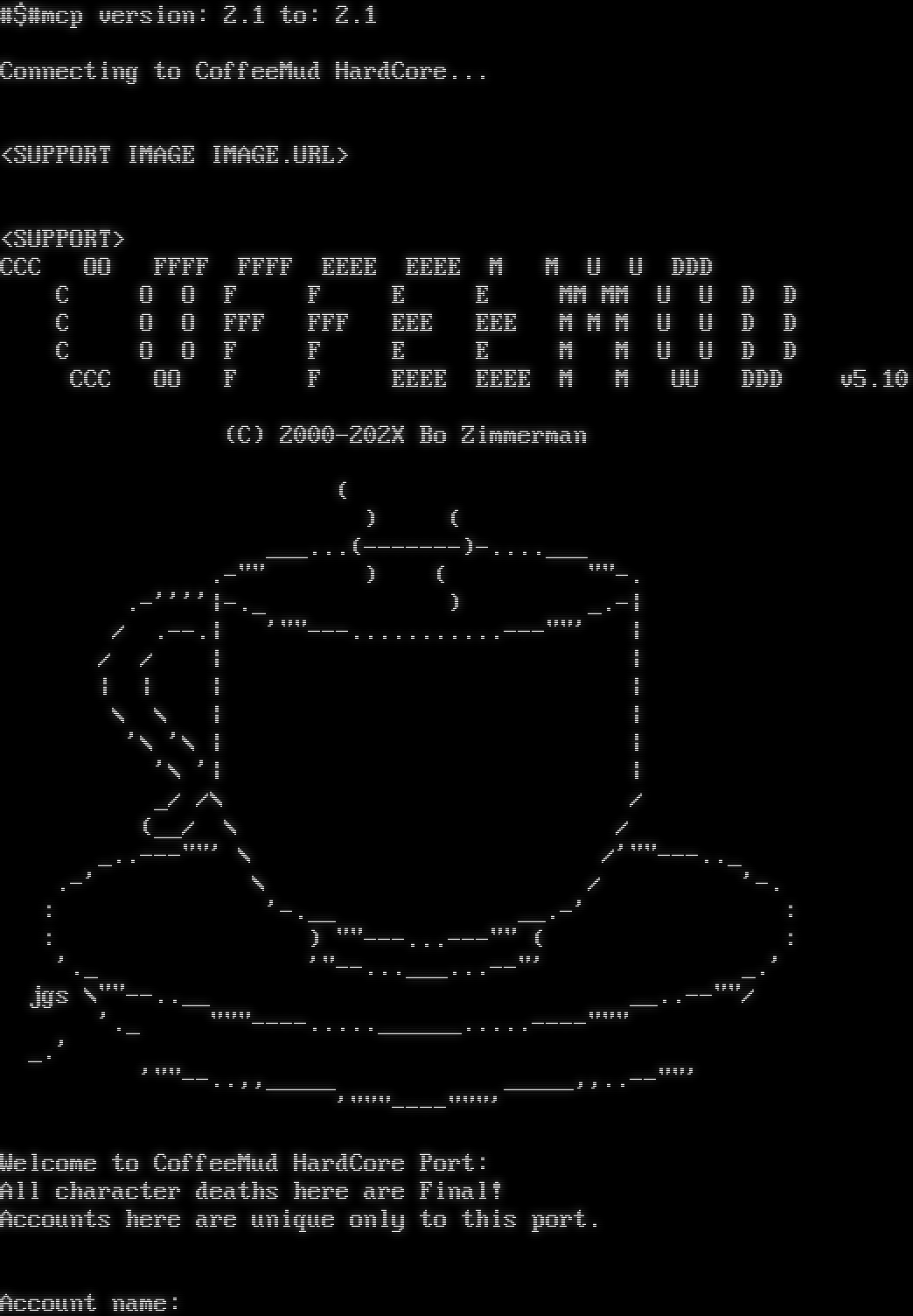 #$#mcp version: 2.1 to: 2.1 Connecting to CoffeeMud HardCore... <SUPPORT IMAGE IMAGE.URL> <SUPPORT> CCC OO FFFF FFFF EEEE EEEE M M U U DDD C O O F F E E MM MM U U D D C O O FFF FFF EEE EEE M M M U U D D C O O F F E E M M U U D D CCC OO F F EEEE EEEE M M UU DDD v5.10 (C) 2000-202X Bo Zimmerman ( ) ( _​__...(-​------)-​....___ .-&quot;&quot; ) ( &quot;&quot;-. .-''''\|-._ ) _.-\| / .​--.\| '&quot;&quot;-​--...........---&quot;&quot;' \| / / \| \| \| \| \| \| \\ \\ \| \| '\\ '\\ \| \| '\\ '\| \| _/ /\\ / (__/ \\ / _​..---&quot;&quot;' \\ /'&quot;&quot;-​--.._ .-' \\ / '-. : '-​.__ _​_.-' : : ) &quot;&quot;-​--...---&quot;&quot; ( : '._ '&quot;-​-...___...--&quot;' _.' jgs \\&quot;&quot;-​-..__ _​_..--&quot;&quot;/ '._ &quot;&quot;&quot;-​---.....______.....----&quot;&quot;&quot; _.' '&quot;&quot;-​-..,,_​____ _​____,,.​.--&quot;&quot;' '&quot;&quot;&quot;-​---&quot;&quot;&quot;' Welcome to CoffeeMud HardCore Port: All character deaths here are Final! Accounts here are unique only to this port. Account name: