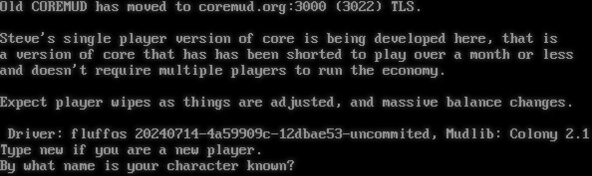 Old COREMUD has moved to coremud.org:3000 (3022) TLS. Steve's single player version of core is being developed here, that is a version of core that has has been shorted to play over a month or less and doesn't require multiple players to run the economy. Expect player wipes as things are adjusted, and massive balance changes. Driver: fluffos 20240714-4a59909c-12dbae53-uncommited, Mudlib: Colony 2.1 Type new if you are a new player. By what name is your character known? <!ENTITY HP "1" PUBLISH><!ENTITY SP "1" PUBLISH><!ENTITY SATCHEL "0" PUBLISH><!ENTITY LIMBS "100" PUBLISH> <!ENTITY LVLUP "0" PUBLISH> <!ENTITY ENEMY "0" PUBLISH> <!ENTITY MAXSP "2"><!ENTITY MAXHP "2"><!ENTITY MAXSATCHEL "100"><!ENTITY MAXLIMBS "100"><!ENTITY MAXLVLUP "100"><!ENTITY MAXENEMY "100"><!ELEMENT RExits FLAG="RoomExit"><!ELEMENT Ex "<SEND>"><GAUGE HP Max=MAXHP Color=Green Caption="Hit Points"><GAUGE SP Max=MAXSP Color=Green Caption="Stamina"><GAUGE LIMBS Max=MAXLIMBS Color=Green Caption="Limb Status"><GAUGE ENEMY Max=MAXENEMY Color=Red Caption="Enemy Health"><GAUGE SATCHEL Max=MAXSATCHEL Color=Green Caption="Ore Satchel"><GAUGE LVLUP Max=MAXLVLUP Color=Green Caption="% to Level Up"> Invalid entry. Please try again.