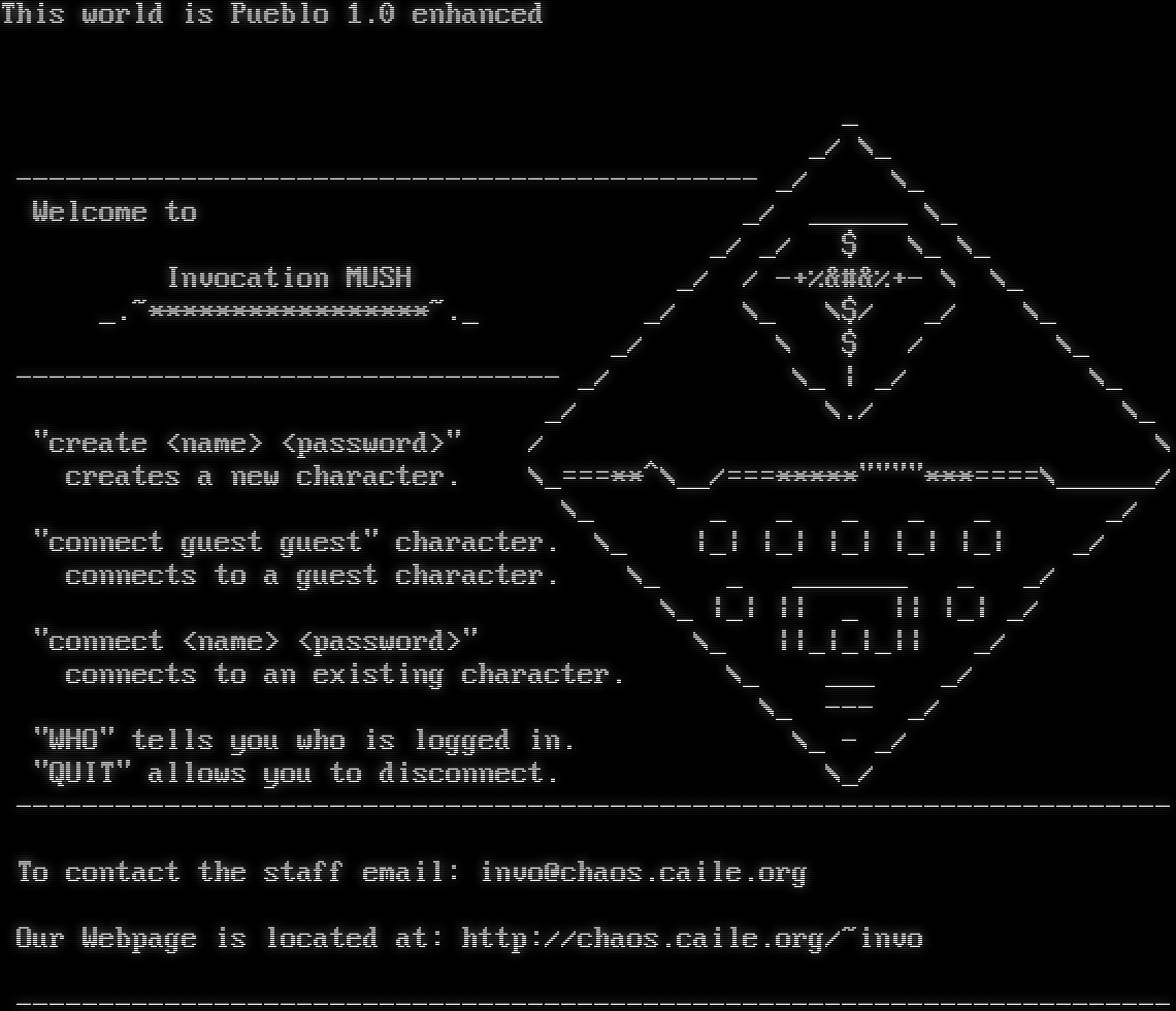 This world is Pueblo 1.0 enhanced _ _/ \\_ -​-------------------------------------------- _/ \\_ Welcome to _/ _​_____ \\_ _/ _/ $ \\_ \\_ Invocation MUSH _/ / -+%&#&%+- \\ \\_ _.~\*\*\*\*\*\*\*\*\*\*\*\*\*\*\*\*\*~._ _/ \\_ \\$/ _/ \\_ _/ \\ $ / \\_ -​-------------------------------- _/ \\_ \| _/ \\_ _/ \\./ \\_ "create <name> <password>" / \\ creates a new character. \\_​===\*\*^\\__/===\*\*\*\*\*"​"""\*\*\*=​===\\_​_____/ \\_ _ _ _ _ _ _/ "connect guest guest" character. \\_ \|_\| \|_\| \|_\| \|_\| \|_\| _/ connects to a guest character. \\_ _ _​______ _ _/ \\_ \|_\| \|\| _ \|\| \|_\| _/ "connect <name> <password>" \\_ \|\|_\|_\|_\|\| _/ connects to an existing character. \\_ ___ _/ \\_ --- _/ "WHO" tells you who is logged in. \\_ - _/ "QUIT" allows you to disconnect. \\_/ -​--------------------------------------------------------------------- To contact the staff email: invo@chaos.caile.org Our Webpage is located at: http://chaos.caile.org/~invo -​---------------------------------------------------------------------