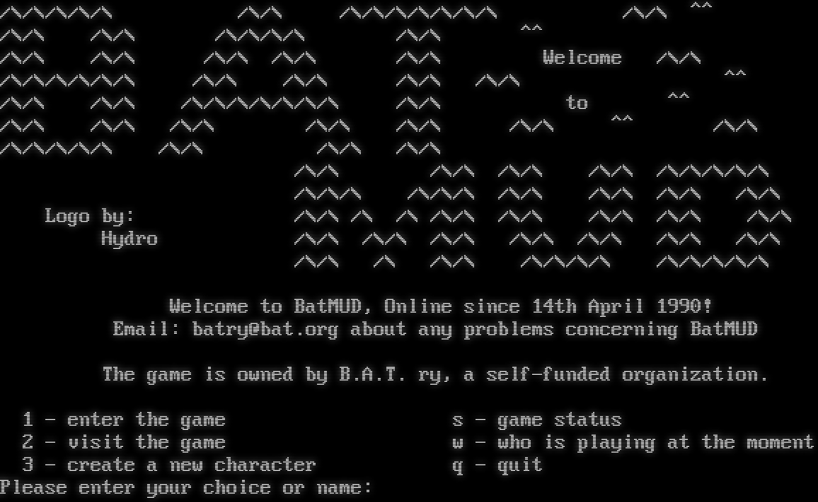 /\\/\\/\\/\\/\\ /\\/\\ /\\/\\/\\/\\/\\/\\/\\ /\\/\\ ^^ /\\/\\ /\\/\\ /\\/\\/\\/\\ /\\/\\ ^^ /\\/\\ /\\/\\ /\\/\\ /\\/\\ /\\/\\ Welcome /\\/\\ /\\/\\/\\/\\/\\/\\ /\\/\\ /\\/\\ /\\/\\ /\\/\\ ^^ /\\/\\ /\\/\\ /\\/\\/\\/\\/\\/\\/\\ /\\/\\ to ^^ /\\/\\ /\\/\\ /\\/\\ /\\/\\ /\\/\\ /\\/\\ ^^ /\\/\\ /\\/\\/\\/\\/\\ /\\/\\ /\\/\\ /\\/\\ /\\/\\ /\\/\\ /\\/\\ /\\/\\ /\\/\\/\\/\\/\\ /\\/\\/\\ /\\/\\/\\ /\\/\\ /\\/\\ /\\/\\ /\\/\\ Logo by: /\\/\\ /\\ /\\ /\\/\\ /\\/\\ /\\/\\ /\\/\\ /\\/\\ Hydro /\\/\\ /\\/\\ /\\/\\ /\\/\\ /\\/\\ /\\/\\ /\\/\\ /\\/\\ /\\ /\\/\\ /\\/\\/\\/\\ /\\/\\/\\/\\/\\ Welcome to BatMUD, Online since 14th April 1990! Email: batry@bat.org about any problems concerning BatMUD The game is owned by B.A.T. ry, a self-funded organization. 1 - enter the game s - game status 2 - visit the game w - who is playing at the moment 3 - create a new character q - quit Please enter your choice or name: