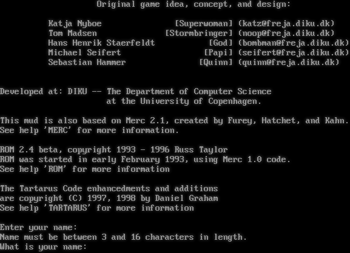 Original game idea, concept, and design: Katja Nyboe [Superwoman] (katz@freja.diku.dk) Tom Madsen [Stormbringer] (noop@freja.diku.dk) Hans Henrik Staerfeldt [God] (bombman@freja.diku.dk) Michael Seifert [Papi] (seifert@freja.diku.dk) Sebastian Hammer [Quinn] (quinn@freja.diku.dk) Developed at: DIKU -- The Department of Computer Science at the University of Copenhagen. This mud is also based on Merc 2.1, created by Furey, Hatchet, and Kahn. See help 'MERC' for more information. ROM 2.4 beta, copyright 1993 - 1996 Russ Taylor ROM was started in early February 1993, using Merc 1.0 code. See help 'ROM' for more information The Tartarus Code enhancedments and additions are copyright (C) 1997, 1998 by Daniel Graham See help 'TARTARUS' for more information Enter your name: Name must be between 3 and 16 characters in length. What is your name:
