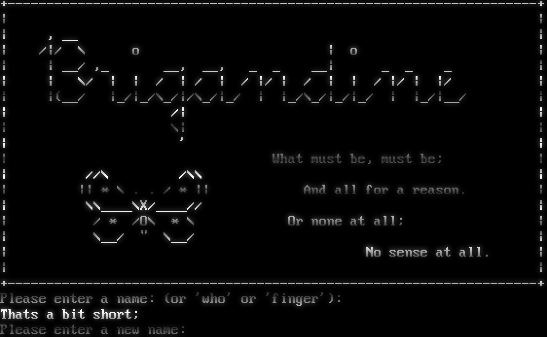 +​--------------------------------------------------------------------+ \| \| \| , __ \| \| /\|/ \\ o \| o \| \| \| __/ ,_ __, __, _ _ __\| _ _ _ \| \| \| \\/ \| \| / \| / \| / \|/ \| / \| \| / \|/ \| \|/ \| \| \|(__/ \|_/\|_/\\_/\|/\\_/\|_/ \| \|_/\\_/\|_/\|_/ \| \|_/\|__/ \| \| /\| \| \| \\\| \| \| ' \| \| What must be, must be; \| \| //\\ /\\\\ \| \| \|\| \* \\ . . / \* \|\| And all for a reason. \| \| \\\\_​___\\X/_​___// \| \| / \* /O\\ \* \\ Or none at all; \| \| \\__/ " \\__/ \| \| No sense at all. \| \| \| +​--------------------------------------------------------------------+ Please enter a name: (or 'who' or 'finger'): Thats a bit short; Please enter a new name: