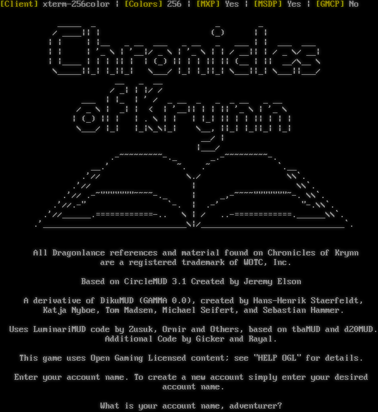 Attempting to Detect Client, Please Wait... [Client] xterm-256color \| [Colors] 256 \| [MXP] Yes \| [MSDP] Yes \| [GMCP] No _​____ _ _ _ / _​___\|\| \| (_) \| \| \| \| \| \|__ _ __ ___ _ __ _ ___ \| \| ___ ___ \| \| \| '_ \\ \| '__\|/ _ \\ \| '_ \\ \| \| / __\|\| \| / _ \\/ __\| \| \|_​___ \| \| \| \|\| \| \| (_) \|\| \| \| \|\| \|\| (__ \| \|\| __/\\__ \\ \\_​____\|\|_\| \|_\|\|_\| \\___/ \|_\| \|_\|\|_\| \\___\|\|_\| \\___\|\|___/ __ _ __ / _\| \| \|/ / ___ \| \|_ \| ' / _ __ _ _ _ __ _ __ / _ \\ \| _\| \| < \| '__\|\| \| \| \|\| '_ \\ \| '_ \\ \| (_) \|\| \| \| . \\ \| \| \| \|_\| \|\| \| \| \|\| \| \| \| \\___/ \|_\| \|_\|\\_\\\|_\| \\__, \|\|_\| \|_\|\|_\| \|_\| __/ \| \|___/ .​-~~~~~~~~~-._ _​.-~~~~~~~~~-. __.' ~. .~ \`.__ .'// \\./ \\\\\`. .'// \| \\\\\`. .'// .​-~"""""""~~~~-._ \| _,-​~~~~"""""""~-. \\\\\`. .'//.-" \`-. \| .-' "-.\\\\\`. .'//_​_____.============-.. \\ \| / .​.-============.______\\\\\`. .'_​_____________________________\\\|/_​_____________________________\`. All Dragonlance references and material found on Chronicles of Krynn are a registered trademark of WOTC, Inc. Based on CircleMUD 3.1 Created by Jeremy Elson A derivative of DikuMUD (GAMMA 0.0), created by Hans-Henrik Staerfeldt, Katja Nyboe, Tom Madsen, Michael Seifert, and Sebastian Hammer. Uses LuminariMUD code by Zusuk, Ornir and Others, based on tbaMUD and d20MUD. Additional Code by Gicker and Rayal. This game uses Open Gaming Licensed content; see "HELP OGL" for details. Enter your account name. To create a new account simply enter your desired account name. What is your account name, adventurer?