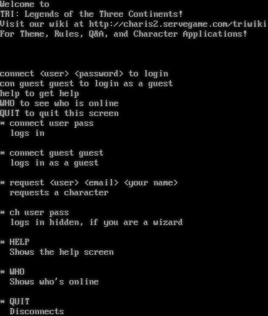 Welcome to TRI: Legends of the Three Continents! Visit our wiki at http://charis2.servegame.com/triwiki For Theme, Rules, Q&A, and Character Applications! connect <user> <password> to login con guest guest to login as a guest help to get help WHO to see who is online QUIT to quit this screen \* connect user pass logs in \* connect guest guest logs in as a guest \* request <user> <email> <your name> requests a character \* ch user pass logs in hidden, if you are a wizard \* HELP Shows the help screen \* WHO Shows who's online \* QUIT Disconnects