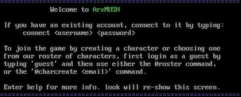 =​============================================================= Welcome to ArxMUSH If you have an existing account, connect to it by typing: connect &lt;username&gt; &lt;password&gt; To join the game by creating a character or choosing one from our roster of characters, first login as a guest by typing 'guest' and then use either the @roster command, or the '@charcreate &lt;email&gt;' command. Enter help for more info. look will re-show this screen. =​=============================================================