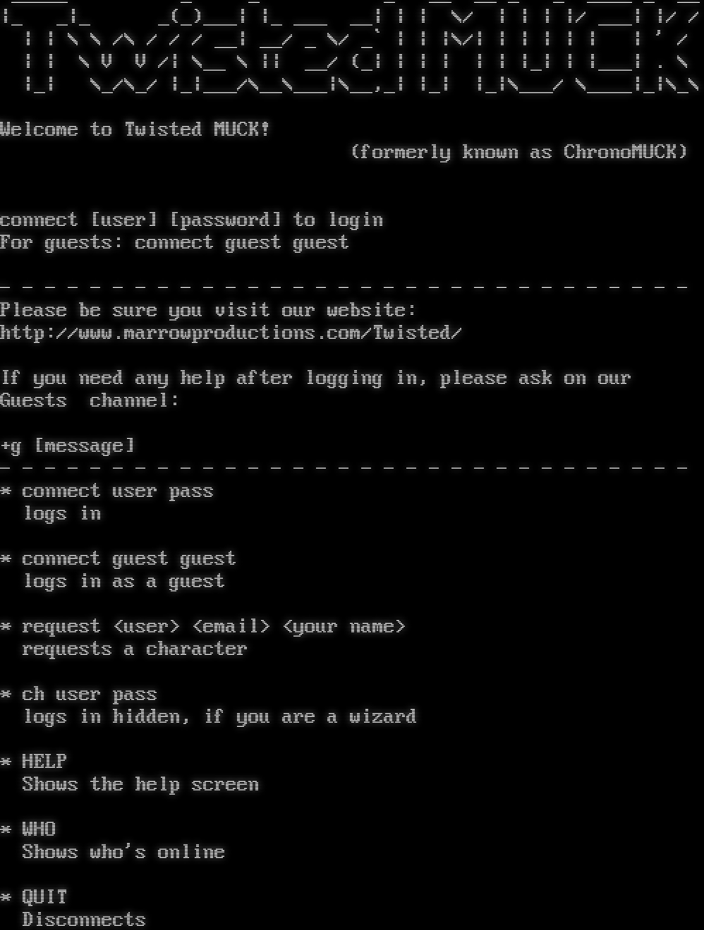 _​____ _ _ _ __ __ _ _ _​___ _ __ \|_ _\|_ _(_)___\| \|_ ___ __\| \| \| \\/ \| \| \| \|/ ___\| \|/ / \| \| \\ \\ /\\ / / / __\| __/ _ \\/ _\` \| \| \|\\/\| \| \| \| \| \| \| ' / \| \| \\ V V /\| \\__ \\ \|\| __/ (_\| \| \| \| \| \| \|_\| \| \|___\| . \\ \|_\| \\_/\\_/ \|_\|___/\\__\\___\|\\__,_\| \|_\| \|_\|\\___/ \\_​___\|_\|\\_\\ Welcome to Twisted MUCK! (formerly known as ChronoMUCK) connect [user] [password] to login For guests: connect guest guest - - - - - - - - - - - - - - - - - - - - - - - - - - - - - - - Please be sure you visit our website: http://www.marrowproductions.com/Twisted/ If you need any help after logging in, please ask on our Guests channel: +g [message] - - - - - - - - - - - - - - - - - - - - - - - - - - - - - - - \* connect user pass logs in \* connect guest guest logs in as a guest \* request <user> <email> <your name> requests a character \* ch user pass logs in hidden, if you are a wizard \* HELP Shows the help screen \* WHO Shows who's online \* QUIT Disconnects