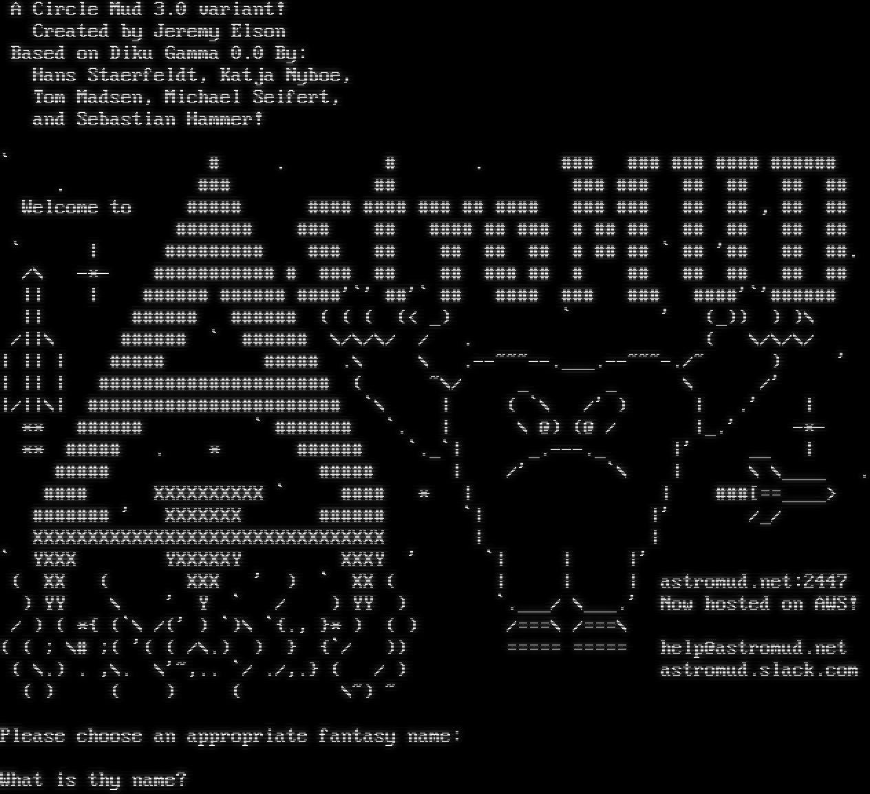 A Circle Mud 3.0 variant! Created by Jeremy Elson Based on Diku Gamma 0.0 By: Hans Staerfeldt, Katja Nyboe, Tom Madsen, Michael Seifert, and Sebastian Hammer! \` # . # . ### ### ### #​### #​##### . ### ## ### ### ## ## ## ## Welcome to #​#### #​### #​### ### ## #​### ### ### ## ## , ## ## #​###### ### ## #​### ## ### # ## ## ## ## ## ## \` \| #​######## ### ## ## ## ## # ## ## \` ## '## ## ##. /\\ -\*- #​########## # ### ## ## ### ## # ## ## ## ## ## \|\| \| #​##### #​##### #​###'\`' ##'\` ## #​### ### ### #​###'\`'#​##### \|\| #​##### #​##### ( ( ( (< _) \` ' (_)) ) )\\ /\|\|\\ #​##### \` #​##### \\/\\/\\/ / . ( \\/\\/\\/ \| \|\| \| #​#### #​#### .\\ \\ .​--~~~--.___.--~~~-./~ ) ' \| \|\| \| #​#################### ( ~\\/ _ _ \\ /' \|/\|\|\\\| #​###################### \`\\ \| ( \`\\ /' ) \| .' \| \*\* #​##### \` #​###### \`. \| \\ @) (@ / \|_.' -\*- \*\* #​#### . \* #​##### \`._\`\| _​.---._ \|' __ \| #​#### #​#### \| /' \`\\ \| \\ \\_​___ . #​### XXXXXXXXXX \` #​### \* \| \| ###[=​=____> #​###### ' XXXXXXX #​##### \`\| \|' /_/ XXXXXXXXXXXXXXXXXXXXXXXXXXXXXXXX \| \| \` YXXX YXXXXXY XXXY ' \`\| \| \|' ( XX ( XXX ' ) \` XX ( \| \| \| astromud.net:2447 ) YY \\ ' Y \` / ) YY ) \`.​___/ \\_​__.' Now hosted on AWS! / ) ( \*{ (\`\\ /(' ) \`)\\ \`{., }\* ) ( ) /===\\ /===\\ ( ( ; \\# ;( '( ( /\\.) ) } {\`/ )) =​==== =​==== help@astromud.net ( \\.) . ,\\. \\'~,.. \`/ ./,.} ( / ) astromud.slack.com ( ) ( ) ( \\~) ~ Please choose an appropriate fantasy name: What is thy name?