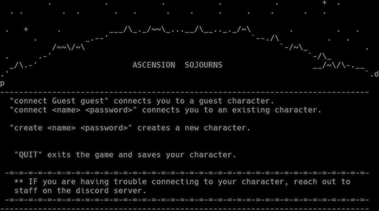 . _ . . . + . . . . .(_) . . . . : . . . . . . . . . . . . -+- . . . . . . / : . . . . . /. . . . . . / . . ' . . + . / . . . / . . . / . . \* . . . . . . \* . . . . . . . . . . . . + . . . . . . . . . . . . . . . + . ___/\\_._/~~\\_​...__/\\_​_.._._/~\\ . . . . _​.--' \`--./\\ . . /~~\\/~\\ \`-/~\\_ . . .-' \`-/\\_ _/\\.-' ASCENSION SOJOURNS __/~\\/\\-​.__ .' \`.dp -​----------------------------------------------------------------------------- "connect Guest guest" connects you to a guest character. "connect <name> <password>" connects you to an existing character. "create <name> <password>" creates a new character. "QUIT" exits the game and saves your character. -​=-=-=-=-=-=-=-=-=-=-=-=-=-=-=-=-=-=-=-=-=-=-=-=-=-=-=-=-=-=-=-=-=-=-=-=-=-=- \*\* IF you are having trouble connecting to your character, reach out to staff on the discord server. -​=-=-=-=-=-=-=-=-=-=-=-=-=-=-=-=-=-=-=-=-=-=-=-=-=-=-=-=-=-=-=-=-=-=-=-=-=-=- -​-----------------------------------------------------------------------------