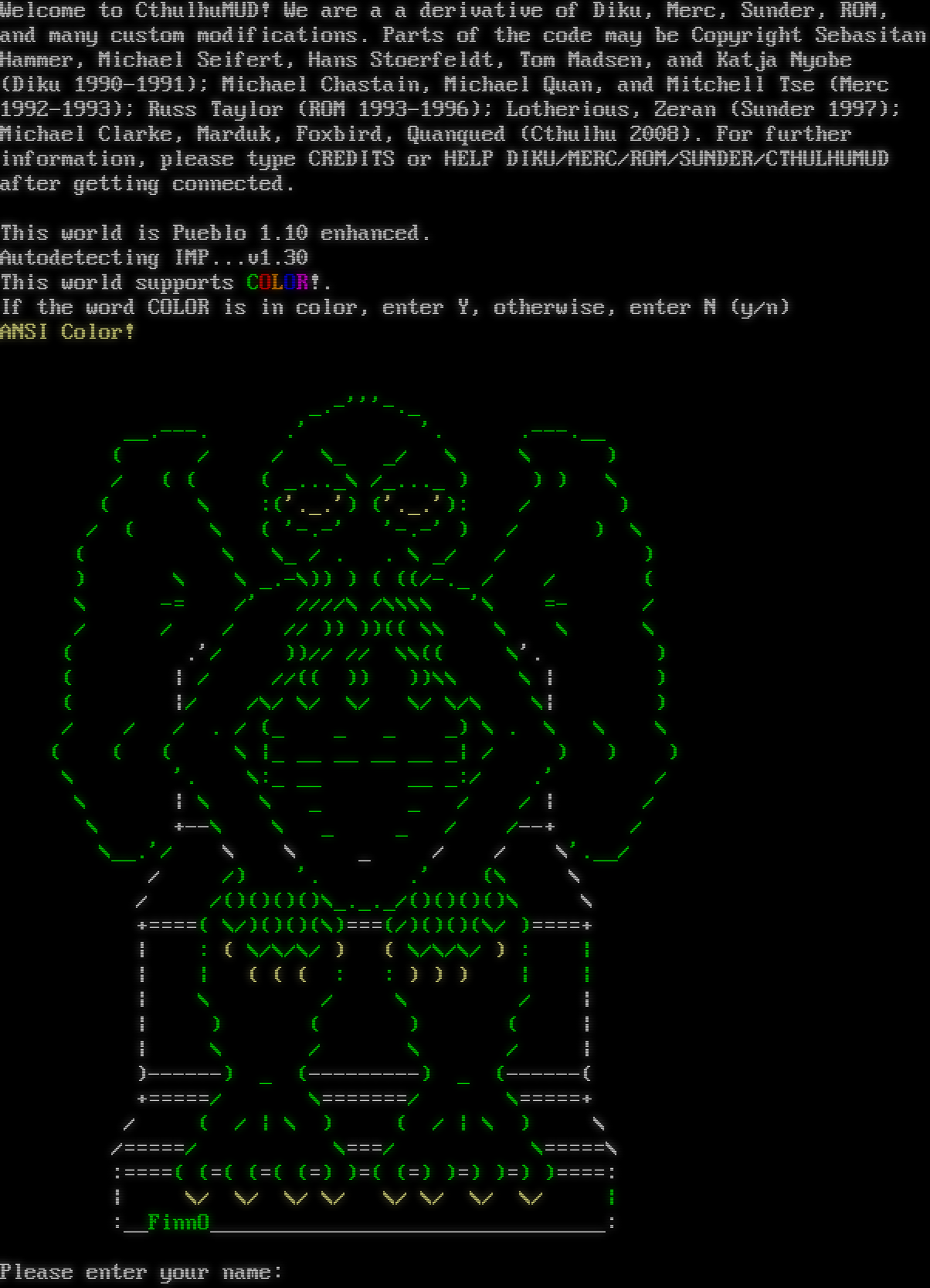 Welcome to CthulhuMUD! We are a a derivative of Diku, Merc, Sunder, ROM, and many custom modifications. Parts of the code may be Copyright Sebasitan Hammer, Michael Seifert, Hans Stoerfeldt, Tom Madsen, and Katja Nyobe (Diku 1990-1991); Michael Chastain, Michael Quan, and Mitchell Tse (Merc 1992-1993); Russ Taylor (ROM 1993-1996); Lotherious, Zeran (Sunder 1997); Michael Clarke, Marduk, Foxbird, Quanqued (Cthulhu 2008). For further information, please type CREDITS or HELP DIKU/MERC/ROM/SUNDER/CTHULHUMUD after getting connected. This world is Pueblo 1.10 enhanced. Autodetecting IMP...v1.30 This world supports COLOR!. If the word COLOR is in color, enter Y, otherwise, enter N (y/n) ANSI Color! _.-'''-._ _​_.---. .' '. .​---.__ ( / / \\_ _/ \\ \\ ) / ( ( ( _​..._\\ /_​..._ ) ) ) \\ ( \\ :('._.') ('._.'): / ) / ( \\ ( '-.-' '-.-' ) / ) \\ ( \\ \\_ / . . \\ _/ / ) ) \\ \\ _.-\\)) ) ( ((/-._ / / ( \\ -= /' ////\\ /\\\\\\\\ '\\ =- / / / / // )) ))(( \\\\ \\ \\ \\ ( .'/ ))// // \\\\(( \\'. ) ( \| / //(( )) ))\\\\ \\ \| ) ( \|/ /\\/ \\/ \\/ \\/ \\/\\ \\\| ) / / / . / (_ _ _ _) \\ . \\ \\ \\ ( ( ( \\ \|_ __ __ __ __ _\| / ) ) ) \\ '. \\:_ __ __ _:/ .' / \\ \| \\ \\ _ _ / / \| / \\ +--\\ \\ _ _ / /--+ / \\__.'/ \\ \\ _ / / \\'.__/ / /) '. .' (\\ \\ / /()()()()\\_​._._/()()()()\\ \\ +​====( \\/)()()(\\)===(/)()()(\\/ )=​===+ \| : ( \\/\\/\\/ ) ( \\/\\/\\/ ) : \| \| \| ( ( ( : : ) ) ) \| \| \| \\ / \\ / \| \| ) ( ) ( \| \| \\ / \\ / \| )-​-----) _ (-​--------) _ (-​-----( +​=====/ \\=​======/ \\=​====+ / ( / \| \\ ) ( / \| \\ ) \\ /=​====/ \\===/ \\=​====\\ :=​===( (=( (=( (=) )=( (=) )=) )=) )=​===: \| \\/ \\/ \\/ \\/ \\/ \\/ \\/ \\/ \| :__FinnO_​_______________________________: Please enter your name: