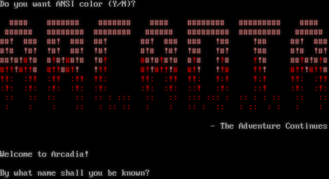Do you want ANSI color (Y/N)? #​### #​###### #​###### #​### #​####### #​######## #​### #​##### #​####### #​####### #​##### #​######## #​######## #​##### ##! ### ##! ### ##! ##! ### ### !## !## ##! ### #!# !#! !#! ##! !#! #!# !#! !## !#! !## #!# !#! ##!#!#!# #!#!##!# !#! ##!#!#!# #!# !!# !!# ##!#!#!# #!!!#!!# #!!##!! !!! #!!#!!!# #!! !!# !!! #!!!#!!# !!: :!! :!! :!! !!: !!: :!! !!: !:! !:! !!: :!! :!: :!: :!: :!: :!: :!: :!: ::! :!: ::! :!: :!: :: :: :: :: :: : ::: :: :: ::: ::: : :: : : :: :: :: : : : :: : :: :: : : :: : :: : :: : : : : - The Adventure Continues Welcome to Arcadia! By what name shall you be known?