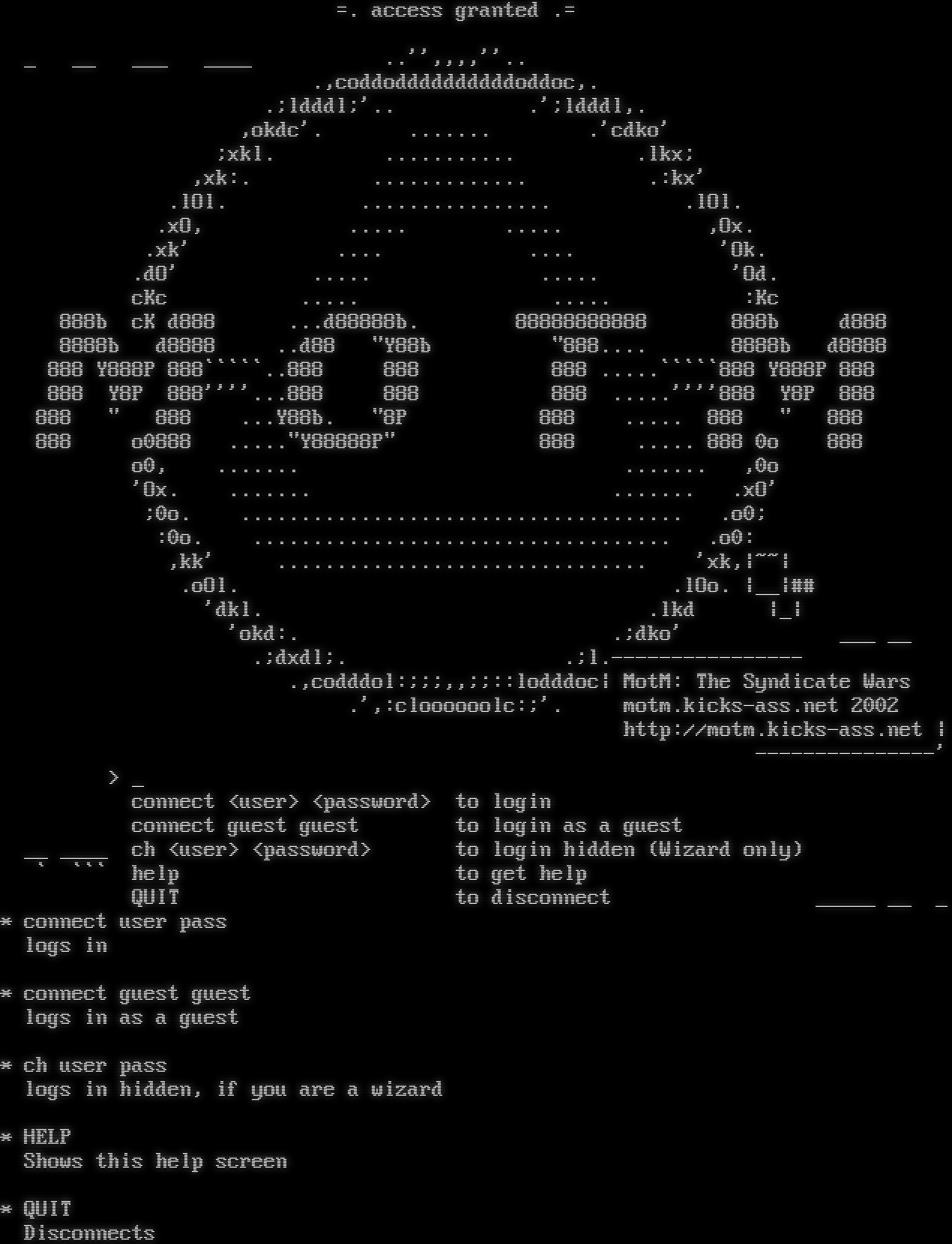 =. access granted .= _ __ ___ _​___ ..'',,,,''.. .,coddoddddddddddoddoc,. .;ldddl;'.. .';ldddl,. ,okdc'. .​...... .'cdko' ;xkl. .​.......... .lkx; ,xk:. .​............ .:kx' .lOl. .​............... .lOl. .xO, .​.... .​.... ,Ox. .xk' .​... .​... 'Ok. .dO' .​.... .​.... 'Od. cKc .​.... .​.... :Kc 888b cK d888 ...d88888b. 88888888888 888b d888 8888b d8888 ..d88 "Y88b "888.​... 8888b d8888 888 Y888P 888\`\`\`\`\`..888 888 888 .​....\`\`\`\`\`888 Y888P 888 888 Y8P 888''''...888 888 888 .​....''''888 Y8P 888 888 " 888 ...Y88b. "8P 888 .​.... 888 " 888 888 o0888 .​...."Y88888P" 888 .​.... 888 0o 888 o0, .​...... .​...... ,0o 'Ox. .​...... .​...... .xO' ;0o. .​.................................... .o0; :0o. .​.................................. .o0: ,kk' .​.............................. 'xk,\|~~\| .oOl. .lOo. \|__\|## 'dkl. .lkd \|_\| 'okd:. .;dko' ___ __ .;dxdl;. .;l.​---------------- .,codddol:;;;,,;;::lodddoc\| MotM: The Syndicate Wars .',:cloooooolc:;'. motm.kicks-ass.net 2002 http://motm.kicks-ass.net \| -​--------------' > _ connect <user> <password> to login connect guest guest to login as a guest __ _​___ ch <user> <password> to login hidden (Wizard only) \` \`\`\` help to get help QUIT to disconnect _​____ __ _ \* connect user pass logs in \* connect guest guest logs in as a guest \* ch user pass logs in hidden, if you are a wizard \* HELP Shows this help screen \* QUIT Disconnects