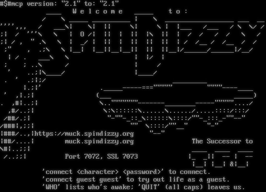 #$#mcp version: "2.1" to: "2.1" _​___ W e l c o m e _​____ t o : / \\ _​____ _​_________ \| \\ _​_________________ ___ __ '''',,, / ___\\\| \\\| \|\| \\\| \\ \| \|___ /___ / \\ \\/ / ;\| / '''\\ \\ \| O /\| \|\| \| \|\| \|\\ \|\| \| / / / / \\ / ;\| / , " .\\ \\ \| _/ \| \|\| \| \|\| \|\| \|\| \| / /__ / /__ / / ;" , .;\\ \\ \|__\| \|__\|\|__\|__\|\| \|\| \|\|__\|/_​_____/_​_____\|/__/ \| / . ___\\ \\ \| \|/ \| ; ; ..\\ / \| / ' ..;\|\\_​___/ \|_​___/ . ' .;\|;/ _​________ \|.;\|' .​_____-----===""""" "​"""----____ ' ,\|.;\| (___ _​____) . ,#\|..;\| \\.​."""""""-------________-----"""""..../ ,#/..;\| \\:\\::::::\\.​.....\\.​...../.​....::::/:::/ /##/.;\| "​-""-_::_\\::::::\\::::/"​"-_:::_​-""--" /###\|,;;\| "" \\::::/"​"__" "-" \|###/..,\|https://muck.spindizzy.org "​--" \|##/.​...\| muck.spindizzy.org The Successor to \\#\|..;;\| _​___ _​___ _​___ /..;;\| Port 7072, SSL 7073 \|_ _\|\| -- \| -- \|__\| \|__\| &\|__\| 'connect <character> <password>' to connect. 'connect guest guest' to try out life as a guest. 'WHO' lists who's awake; 'QUIT' (all caps) leaves us.