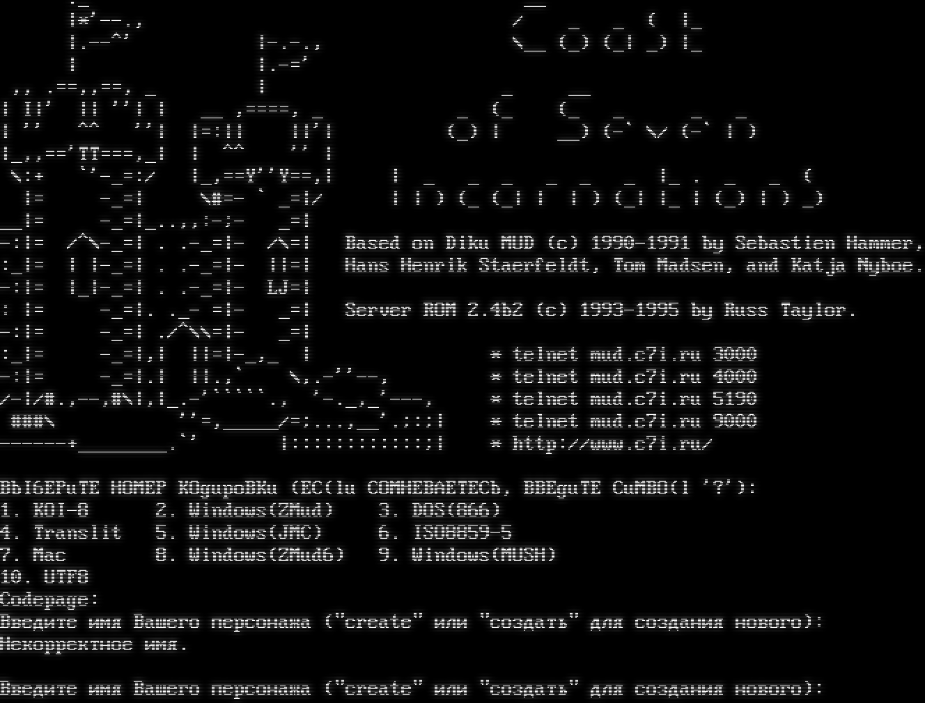 ._ __ \|\*'--., / _ _ ( \|_ \|.​--^' \|-​.-., \\__ (_) (_\| _) \|_ \| \|.-=' ,, .==,,==, _ \| _ __ \| I\|' \|\| ''\| \| __ ,=​===, _ _ (_ (_ _ _ _ \| '' ^^ ''\| \|=:\|\| \|\|'\| (_) \| __) (-\` \\/ (-\` \| ) \|_,,=='TT===,_\| \| ^^ '' \| \\:+ \`'-_=:/ \|_,==Y''Y==,\| \| _ _ _ _ _ _ \|_ . _ _ ( \|= -_=\| \\#=- \` _=\|/ \| \| ) (_ (_\| \| \| ) (_\| \|_ \| (_) \| ) _) __\|= -_=\|_..,,:-;- _=\| -:\|= /^\\-_=\| . .​-_=\|- /\\=\| Based on Diku MUD (c) 1990-1991 by Sebastien Hammer, :_\|= \| \|-_=\| . .​-_=\|- \|\|=\| Hans Henrik Staerfeldt, Tom Madsen, and Katja Nyboe. -:\|= \|_\|-_=\| . .​-_=\|- LJ=\| : \|= -_=\|. ._- =\|- _=\| Server ROM 2.4b2 (c) 1993-1995 by Russ Taylor. -:\|= -_=\| ./^\\\\=\|- _=\| :_\|= -_=\|,\| \|\|=\|-_,_ \| \* telnet mud.c7i.ru 3000 -:\|= -_=\|.\| \|\|.,\` \\,.-''--, \* telnet mud.c7i.ru 4000 /-\|/#.,--,#\\\|,\|_.-'\`\`\`\`\`., '-._,_'---, \* telnet mud.c7i.ru 5190 ###\\ ''=,_​____/=;...,__'.;:;\| \* telnet mud.c7i.ru 9000 -​-----+________.\`' \|::::::::::::;\| \* http://www.c7i.ru/ BbI6EPuTE HOMEP KOgupoBKu (EC(lu COMHEBAETECb, BBEguTE CuMBO(l '?'): 1. KOI-8 2. Windows(ZMud) 3. DOS(866) 4. Translit 5. Windows(JMC) 6. ISO8859-5 7. Mac 8. Windows(ZMud6) 9. Windows(MUSH) 10. UTF8 Codepage: Введите имя Вашего персонажа ("create" или "создать" для создания нового): Некорректное имя. Введите имя Вашего персонажа ("create" или "создать" для создания нового):