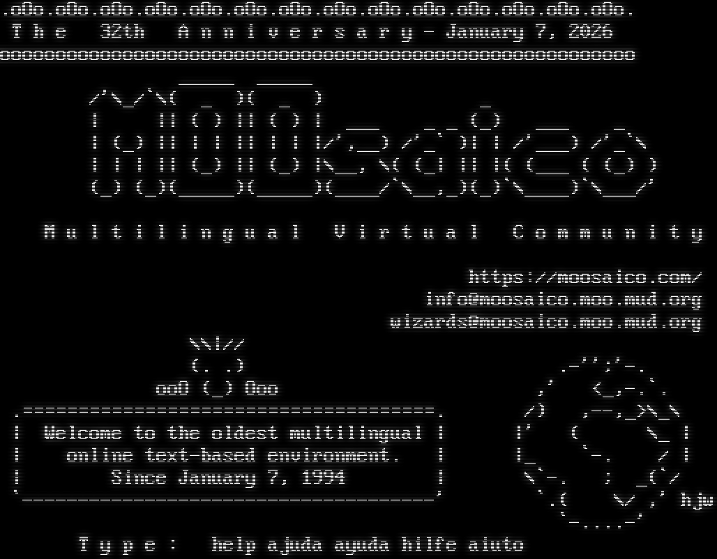 .oOo.oOo.oOo.oOo.oOo.oOo.oOo.oOo.oOo.oOo.oOo.oOo.oOo.oOo. T h e 32th A n n i v e r s a r y - January 7, 2026 ooooooooooooooooooooooooooooooooooooooooooooooooooooooooo _​____ _​____ /'\\_/\`\\( _ )( _ ) _ \| \|\| ( ) \|\| ( ) \| ___ _ _ (_) ___ _ \| (_) \|\| \| \| \|\| \| \| \|/',__) /'_\` )\| \| /'___) /'_\`\\ \| \| \| \|\| (_) \|\| (_) \|\\__, \\( (_\| \|\| \|( (___ ( (_) ) (_) (_)(_​____)(_​____)(_​___/\`\\__,_)(_)\`\\_​___)\`\\___/' M u l t i l i n g u a l V i r t u a l C o m m u n i t y https://moosaico.com/ info@moosaico.moo.mud.org wizards@moosaico.moo.mud.org \\\\\|// (. .) .-'';'-. ooO (_) Ooo ,' <_,-.\`. .​=====================================. /) ,--,_>\\_\\ \| Welcome to the oldest multilingual \| \|' ( \\_ \| \| online text-based environment. \| \|_ \`-. / \| \| Since January 7, 1994 \| \\\`-. ; _(\`/ \`-​------------------------------------' \`.( \\/ ,' hjw \`-​....-' T y p e : help ajuda ayuda hilfe aiuto
