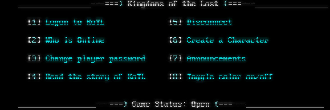 _ _ ( \| / ) \\\|/ /' \|\\ . ,_ ,_ _ / _ ,_ _ ,' (_\| \\_)_/_/ (_(_/_(_/_(_)_/ ( (_/_)_ _ /_​_________ /\\ (_/ Email the owners at: \|/ _/_ /_ _ Chalgyr Vokel (_)_/\| _/__/ (_(/ Chalgyr@yahoo.com -​----\|\\ Gillian Verity _ \\/ Herberkids3@yahoo.com ( \| \| _\|_ \| _ , / _\|_​___)_/(_)_/_)_/(_​___ ( ) _​___ .'\* \*.' __/_\*_\*(_ / _​______ \\ _\\_)/___\\(_/_ /\*_((\\- -/))_\*\\ \\\*\\())(-)(()/\*/ '\*\\(((()))/\*' / '\*\\)).))/\*' \\ / _ \\ - \| - /_ \\ ( ( .;''';. .' ) _\\"__ / )\\ __"/_ \\/ \\ ' / \\/ .' '...' ' ) / / \*\|\* \\ \\ / . \* . \* . \\ / . \* . \* \\ / \* / \* \| \* \\ \* \\ .' \* / \* b \* '. '. _.-' \* / \* Bb \* '-. '-._ _.-' \* \| \* BBb \* '-. '-. (_​_______mrf\\_​___.dBBBb.​________)_​___) _,.-'-'-.,__,.-'-'-.,__,.-'-'-.,__,.-'-'-.,__,.-'-'-.,__,.-'-'-.,_ Kingdoms of the Lost is based on: Original DikuMUD by Hans Staerfeldt, Katja Nyboe, Tom Madsen, Michael Seifert, and Sebastian Hammer Based on MERC 2.1 code by Hatchet, Furey, and Kahn ROM 2.4 copyright (c) 1993-1996 Russ Taylor _,.-'-'-.,__,.-'-'-.,__,.-'-'-.,__,.-'-'-.,__,.-'-'-.,__,.-'-'-.,_ [Press Return to continue] _​_______________---===) Kingdoms of the Lost (=​==---________________ [1] Logon to KoTL [5] Disconnect [2] Who is Online [6] Create a Character [3] Change player password [7] Announcements [4] Read the story of KoTL [8] Toggle color on/off _​________________---===) Game Status: Open (=​==---_________________ _​_______________---===) Kingdoms of the Lost (=​==---________________ [1] Logon to KoTL [5] Disconnect [2] Who is Online [6] Create a Character [3] Change player password [7] Announcements [4] Read the story of KoTL [8] Toggle color on/off _​________________---===) Game Status: Open (=​==---________________\_